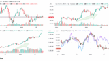 ドル円・ユーロドル・米国債10年利回り・ダウ・ナス・日経225・金・ビットコインの4時間分足チャート
