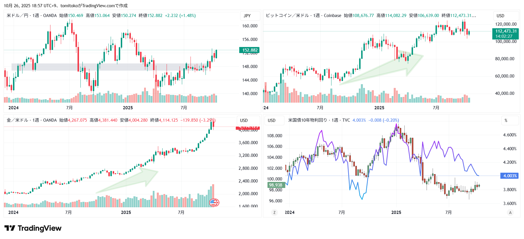 【ドル円・金・ビットコイン】チャートいたずら描き:2025年10月27日~【予想と願望78】