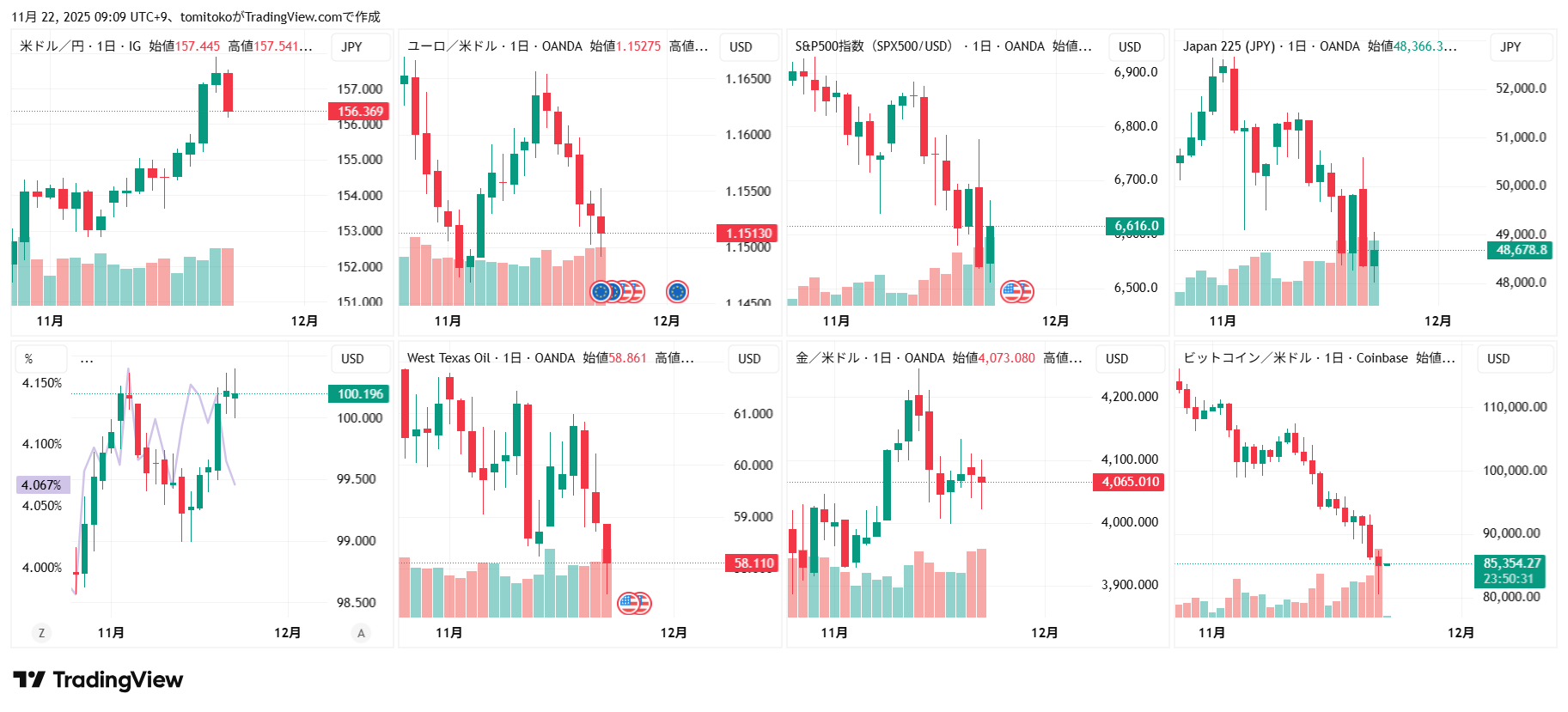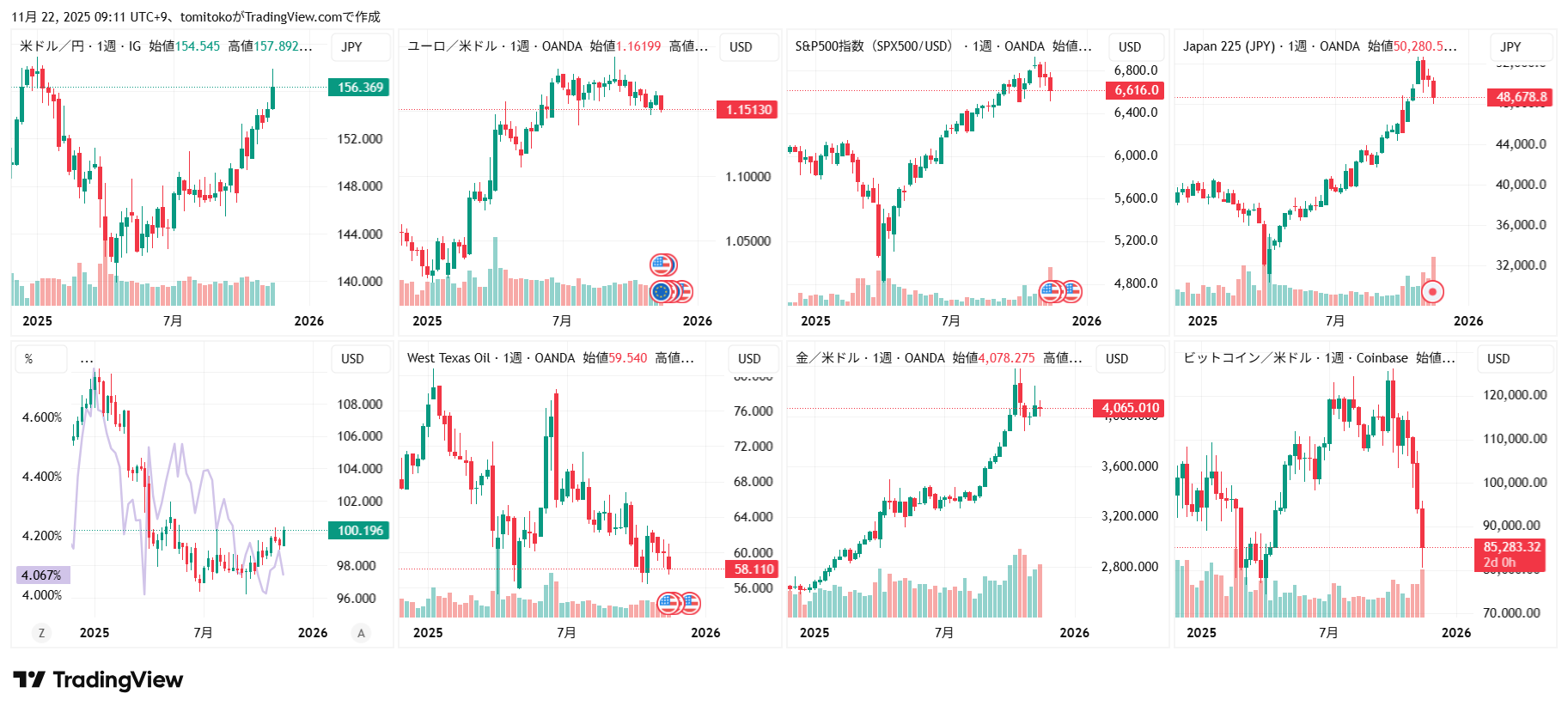 【一週間の振り返り】エヌビディア好決算も米株続落、ドル円一時157円台、ビットコイン8万ドル台へ【2025年11月17日-21日】