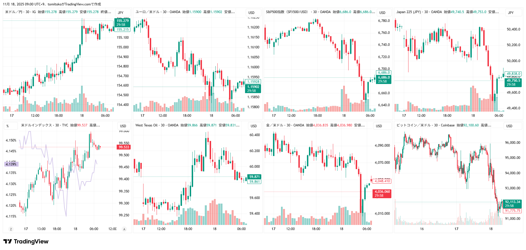 【11/18(火)】米株続落で、ドル円155円台半ば、ビットコイン一時9万ドル割れ【損益:×】