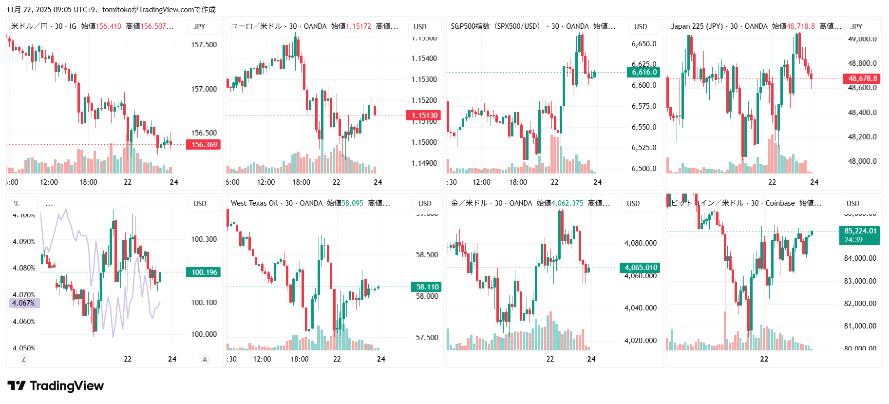ドル円(USDJPY)、ドルインデックス(DXY)、ダウ(DJ-DJI)、ナスダック(NASDAQ-NDX)、日経平均(TVC-NI225)、米国債10年物利回り(TVC-US10Y)、WTI原油(WTICOUS)、金(XAUUSD)、ビットコイン(BTCUSD)、を監視しています。