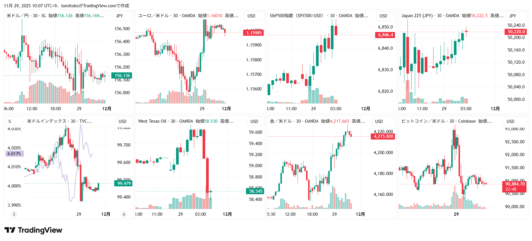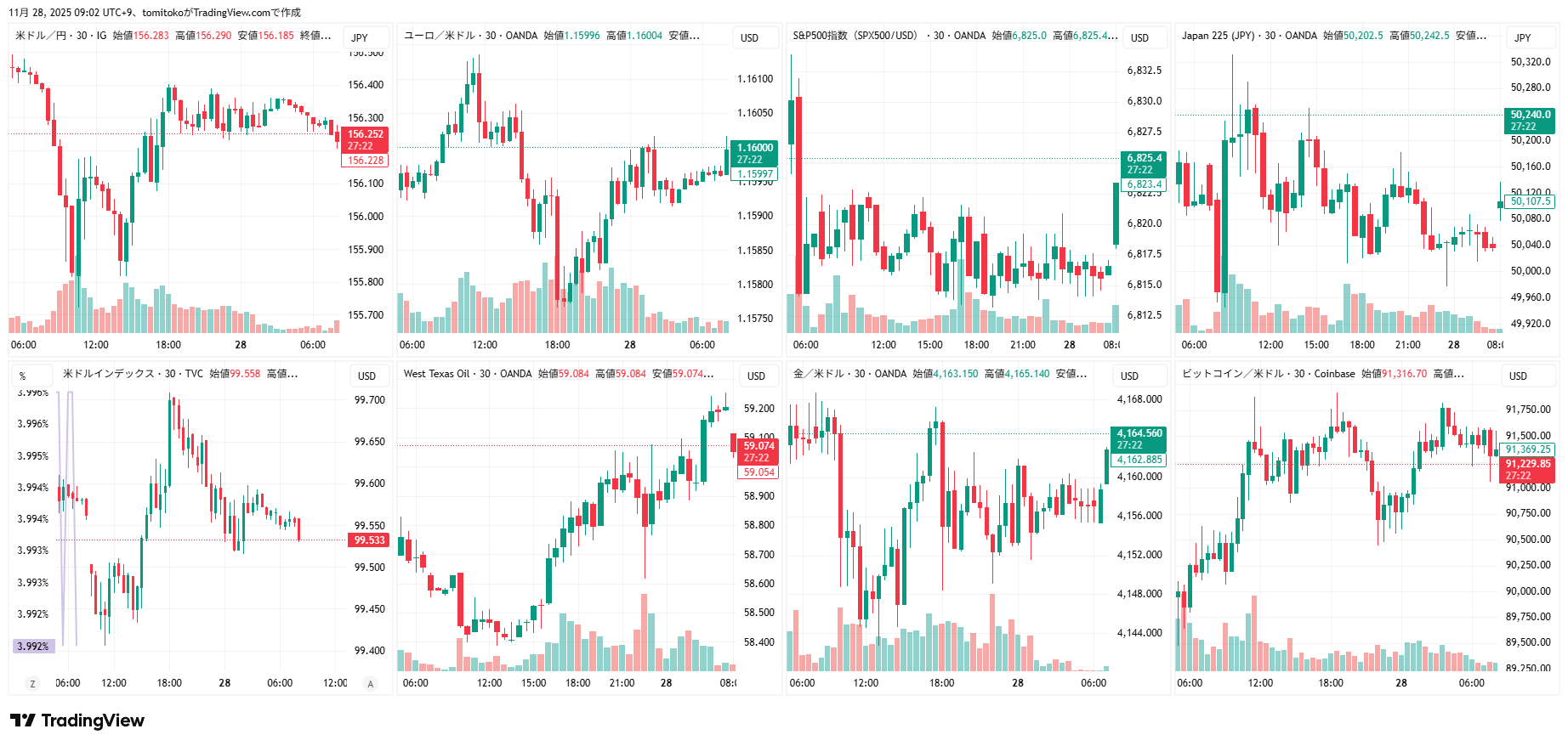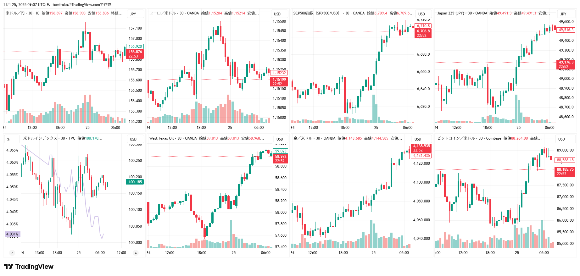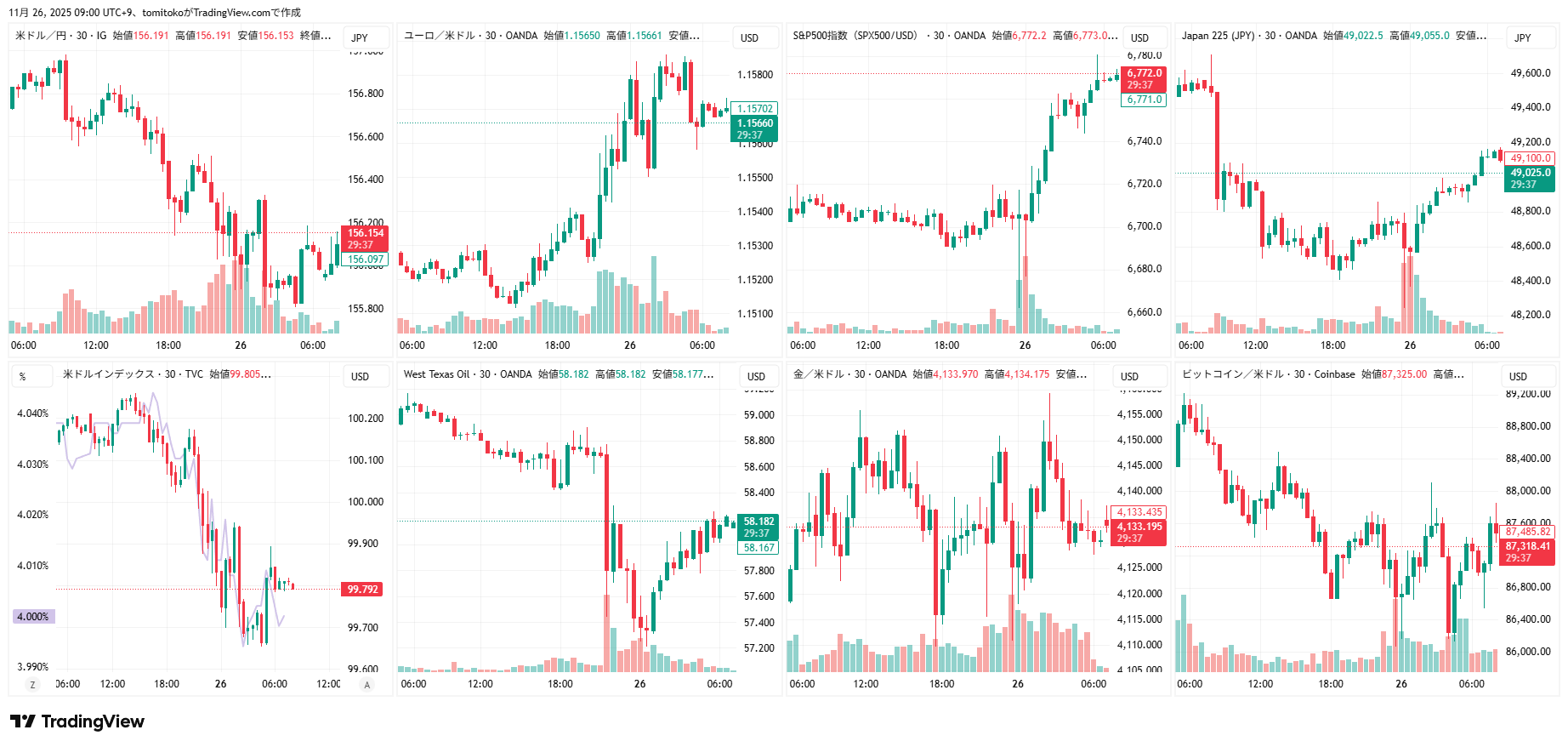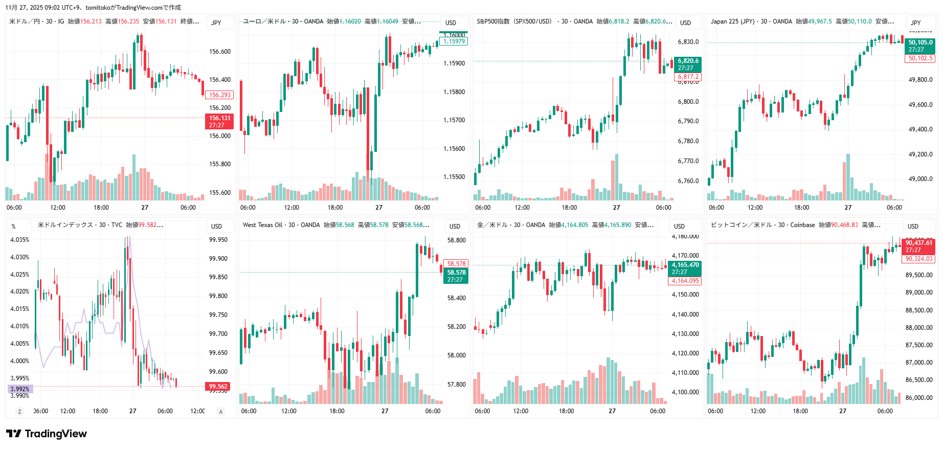 ドル円(USDJPY)、ドルインデックス(DXY)、ダウ(DJ-DJI)、ナスダック(NASDAQ-NDX)、日経平均(TVC-NI225)、米国債10年物利回り(TVC-US10Y)、WTI原油(WTICOUS)、金(XAUUSD)、ビットコイン(BTCUSD)、を監視しています。