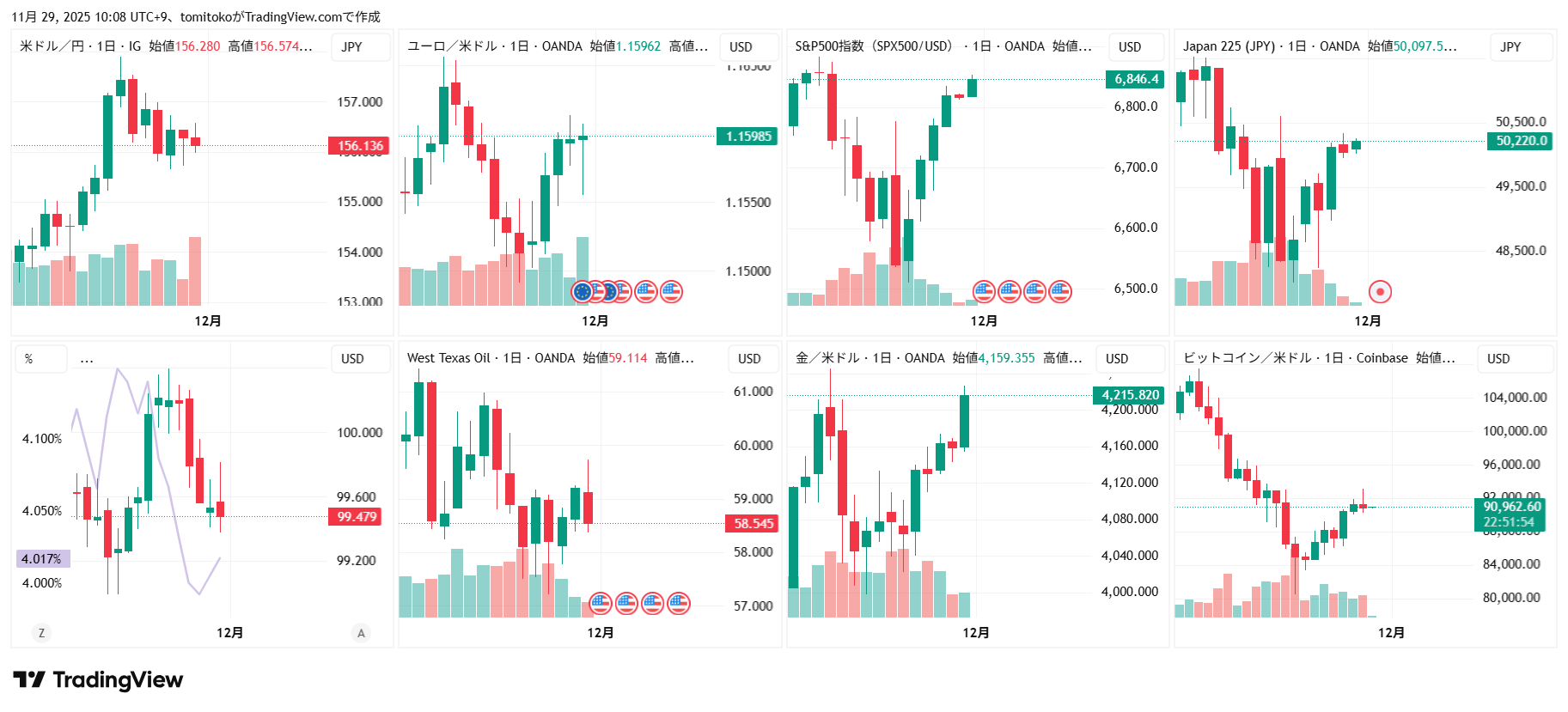 ドル円(USDJPY)、ドルインデックス(DXY)、ユーロドル(EURUSD)、S&P500(SPX500,US500)、日経平均(TVC-NI225)、米国債10年物利回り(TVC-US10Y)、WTI原油(WTICOUS)、金(XAUUSD)、ビットコイン(BTCUSD)、を監視しています。
