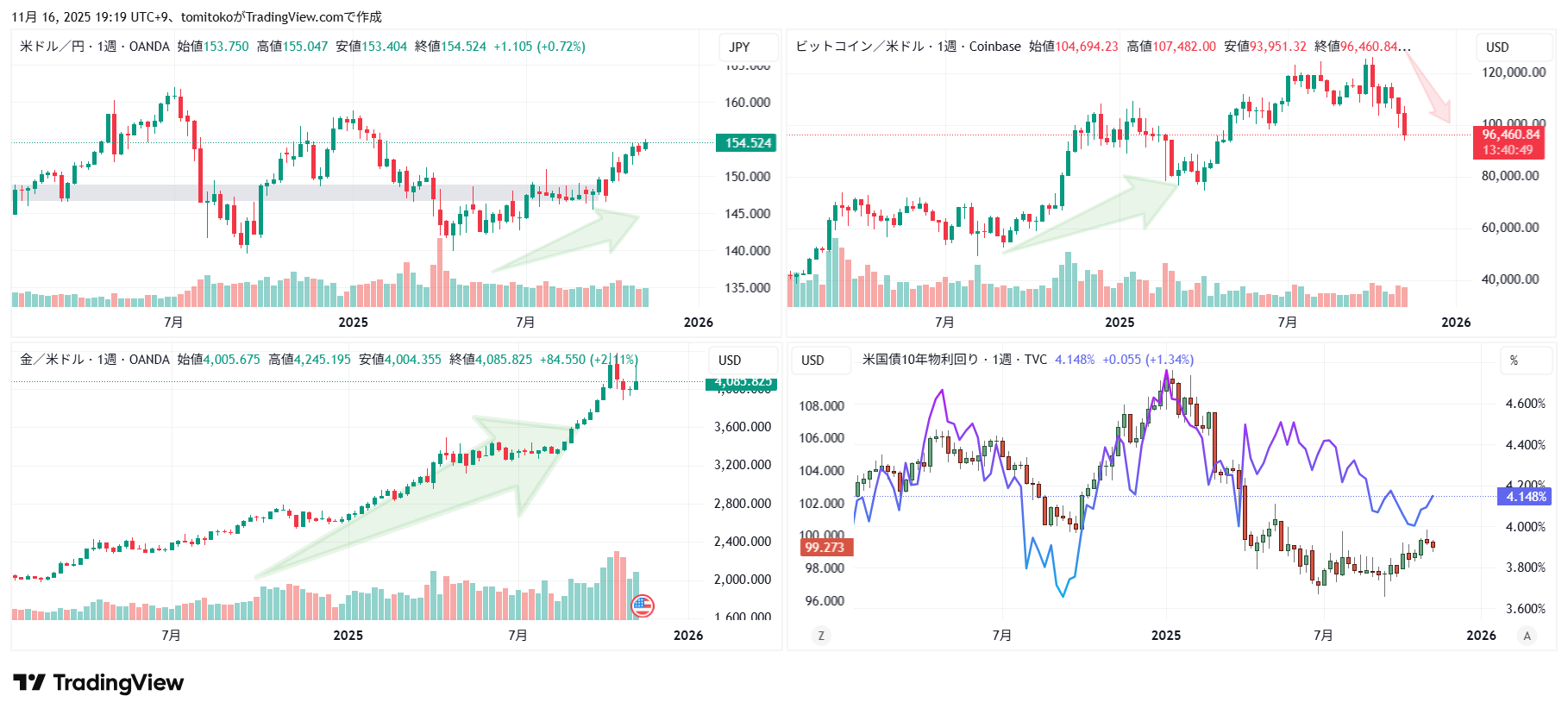 【ドル円・金・ビットコイン】チャートいたずら描き:2025年11月17日~【予想と願望81】