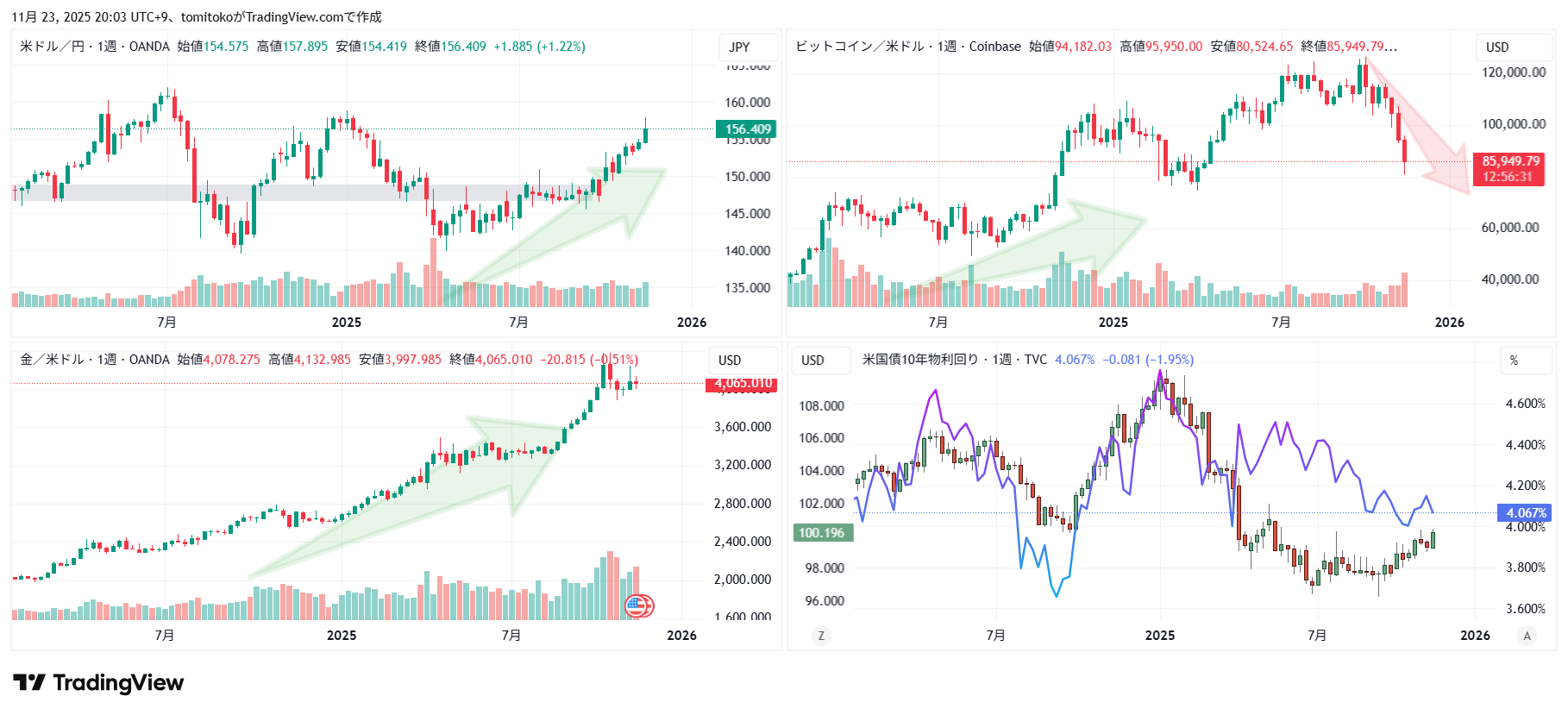 【ドル円・金・ビットコイン】チャートいたずら描き:2025年11月24日~【予想と願望82】