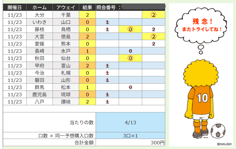 【前回totoの結果】まずは反省会~第1589回 toto(11/23)