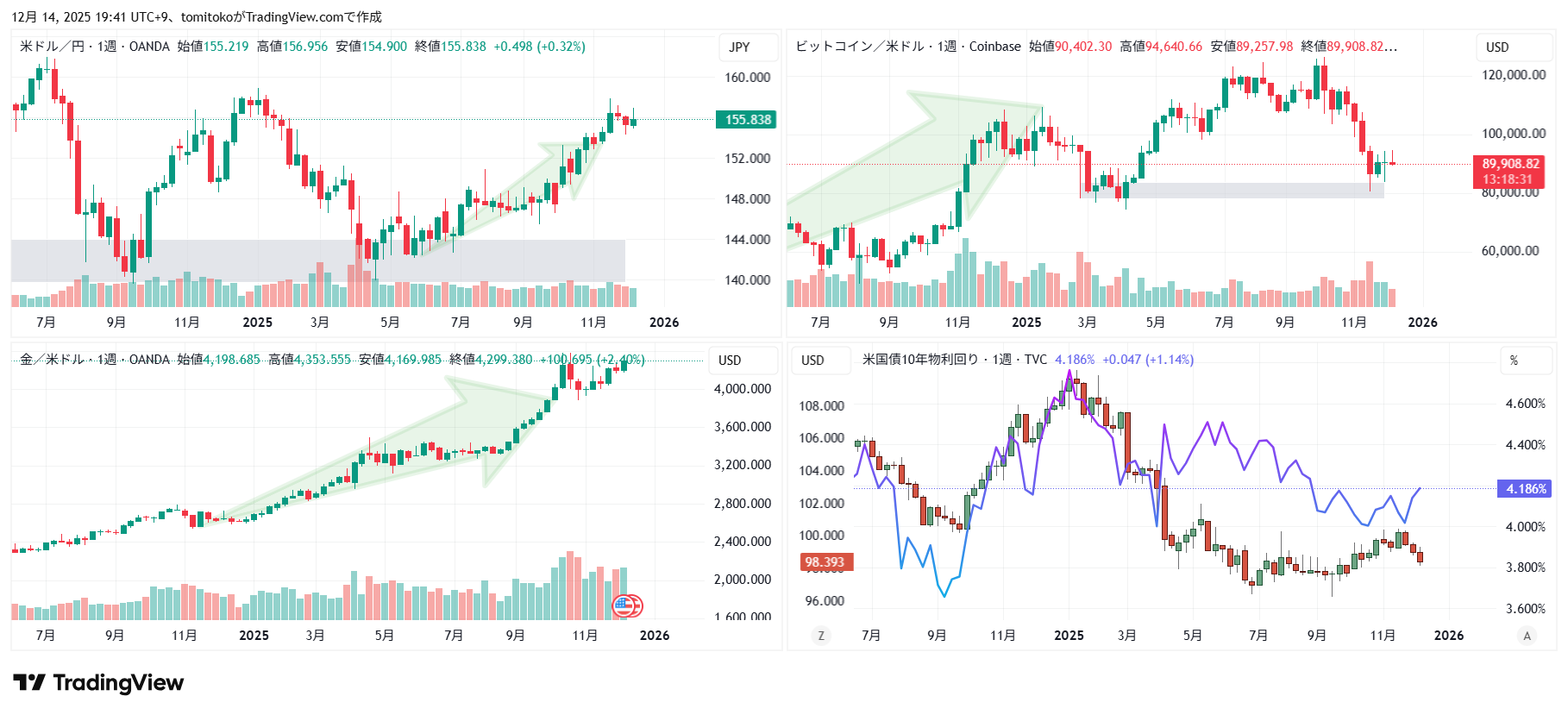 【ドル円・金・ビットコイン】チャートいたずら描き:2025年12月15日~【予想と願望85】