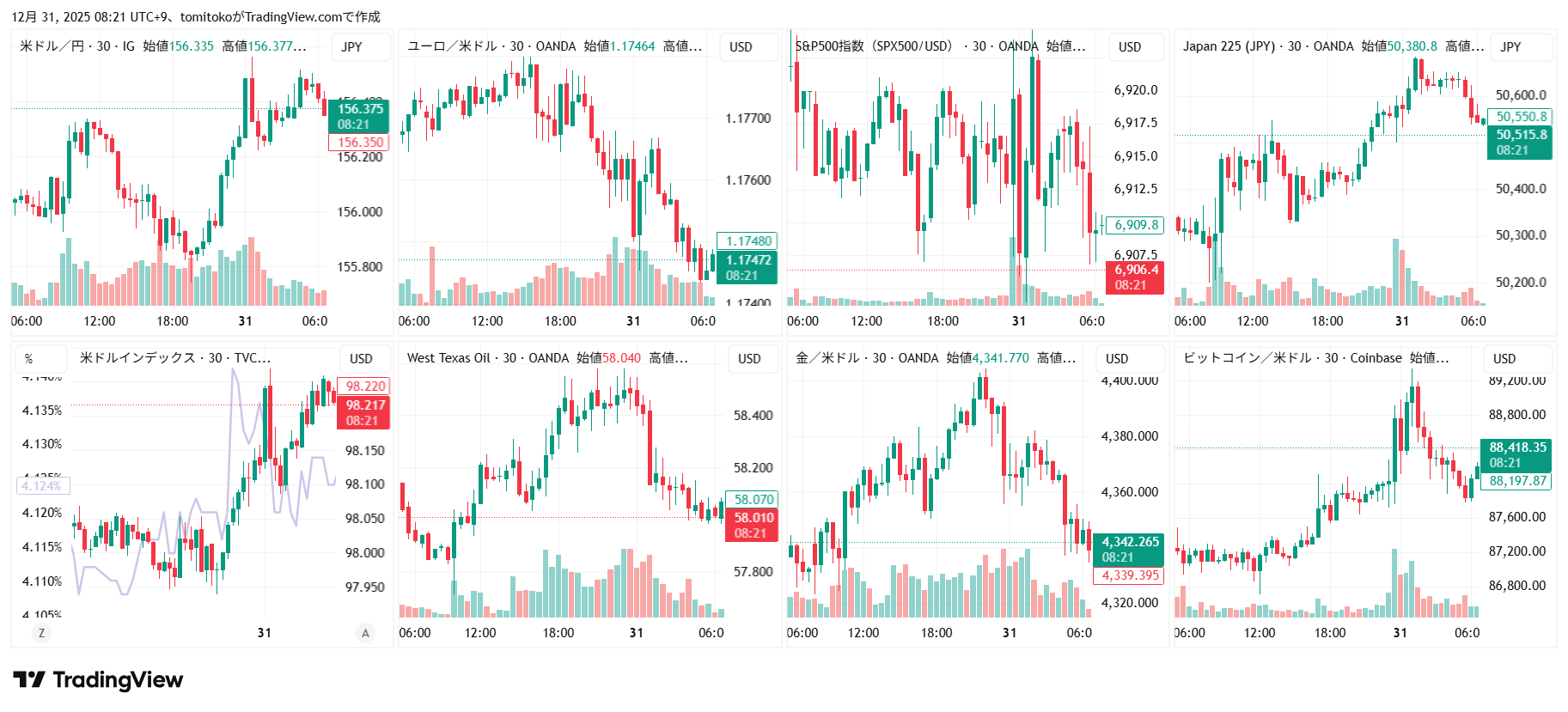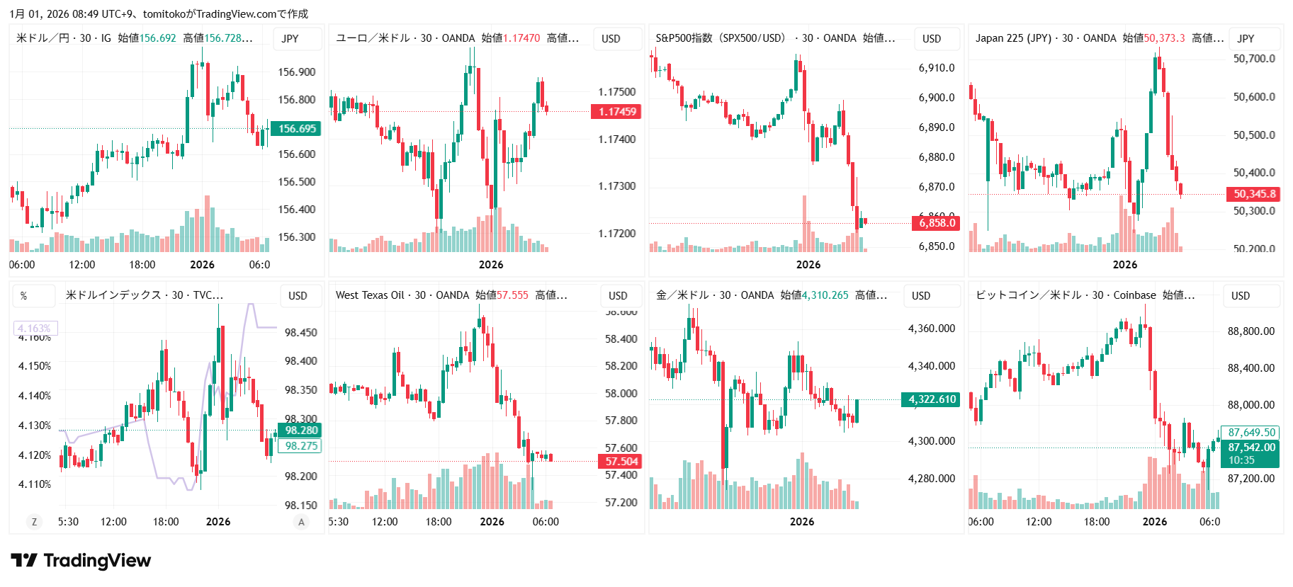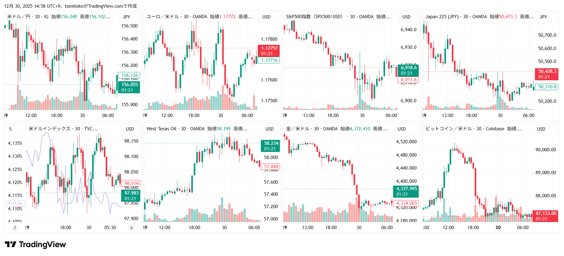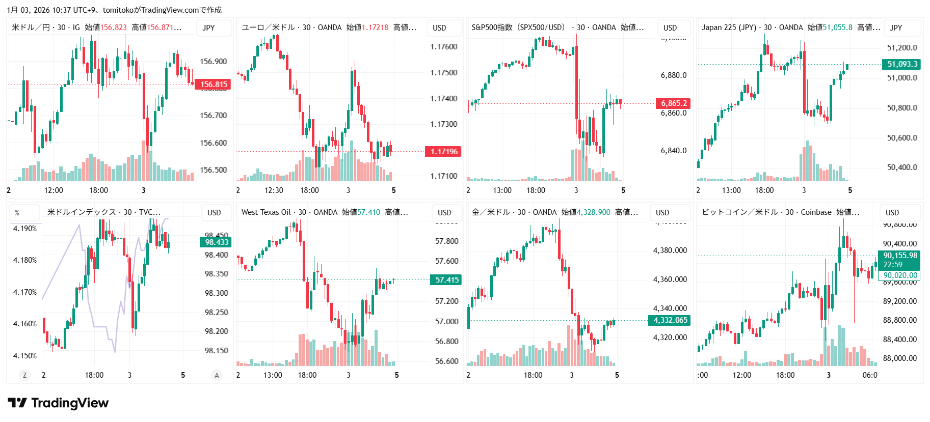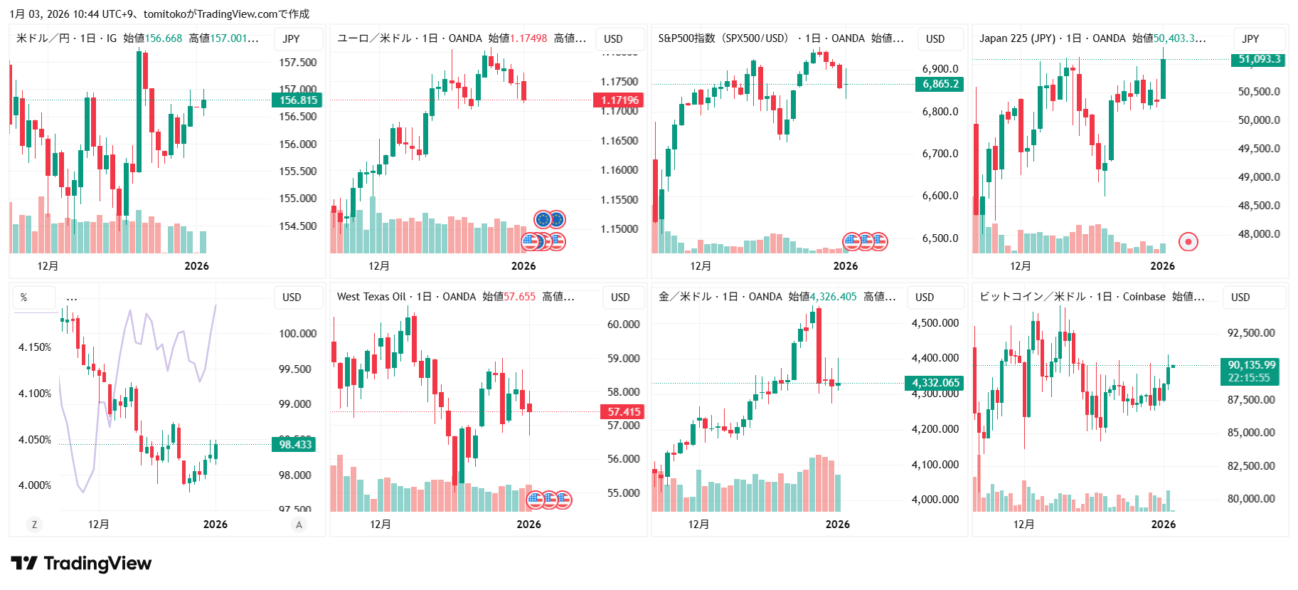 ドル円(USDJPY)、ドルインデックス(DXY)、ユーロドル(EURUSD)、S&P500(SPX500,US500)、日経平均(TVC-NI225)、米国債10年物利回り(TVC-US10Y)、WTI原油(WTICOUS)、金(XAUUSD)、ビットコイン(BTCUSD)、を監視しています。