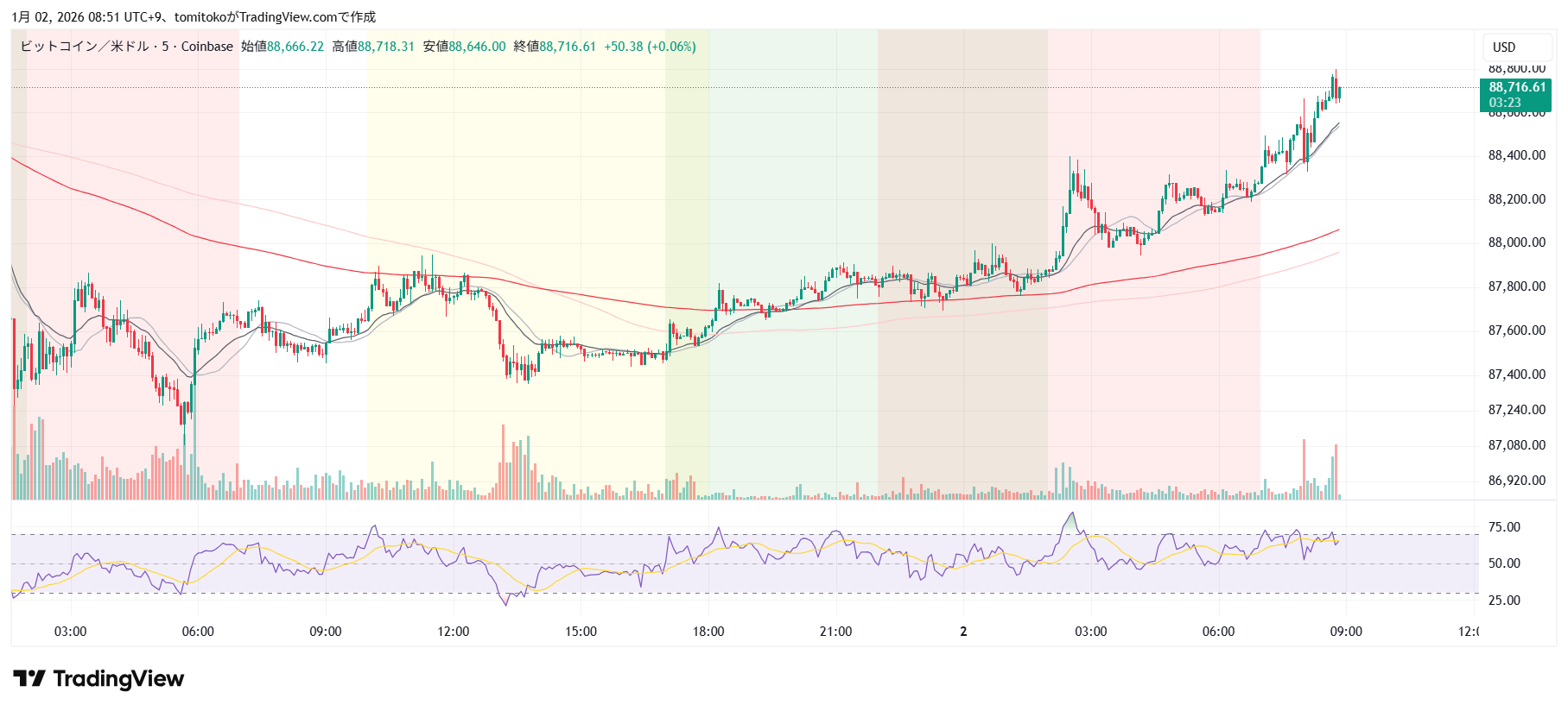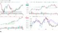 ドル円(USDJPY)、ドルインデックス(DXY)、ダウ(DJ-DJI)、ナスダック(NASDAQ-NDX)、日経平均(TVC-NI225)、米国債10年物利回り(TVC-US10Y)、WTI原油(WTICOUS)、金(XAUUSD)、ビットコイン(BTCUSD)、を監視しています。
