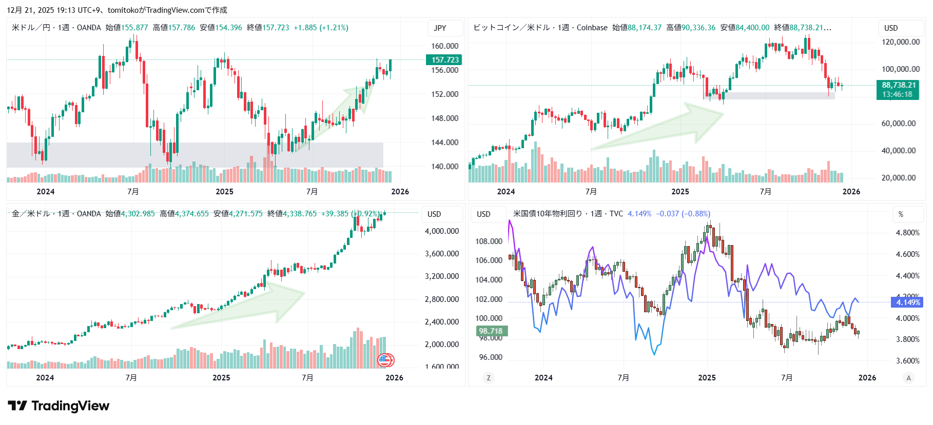 【ドル円・金・ビットコイン】チャートいたずら描き:2025年12月22日~【予想と願望86】