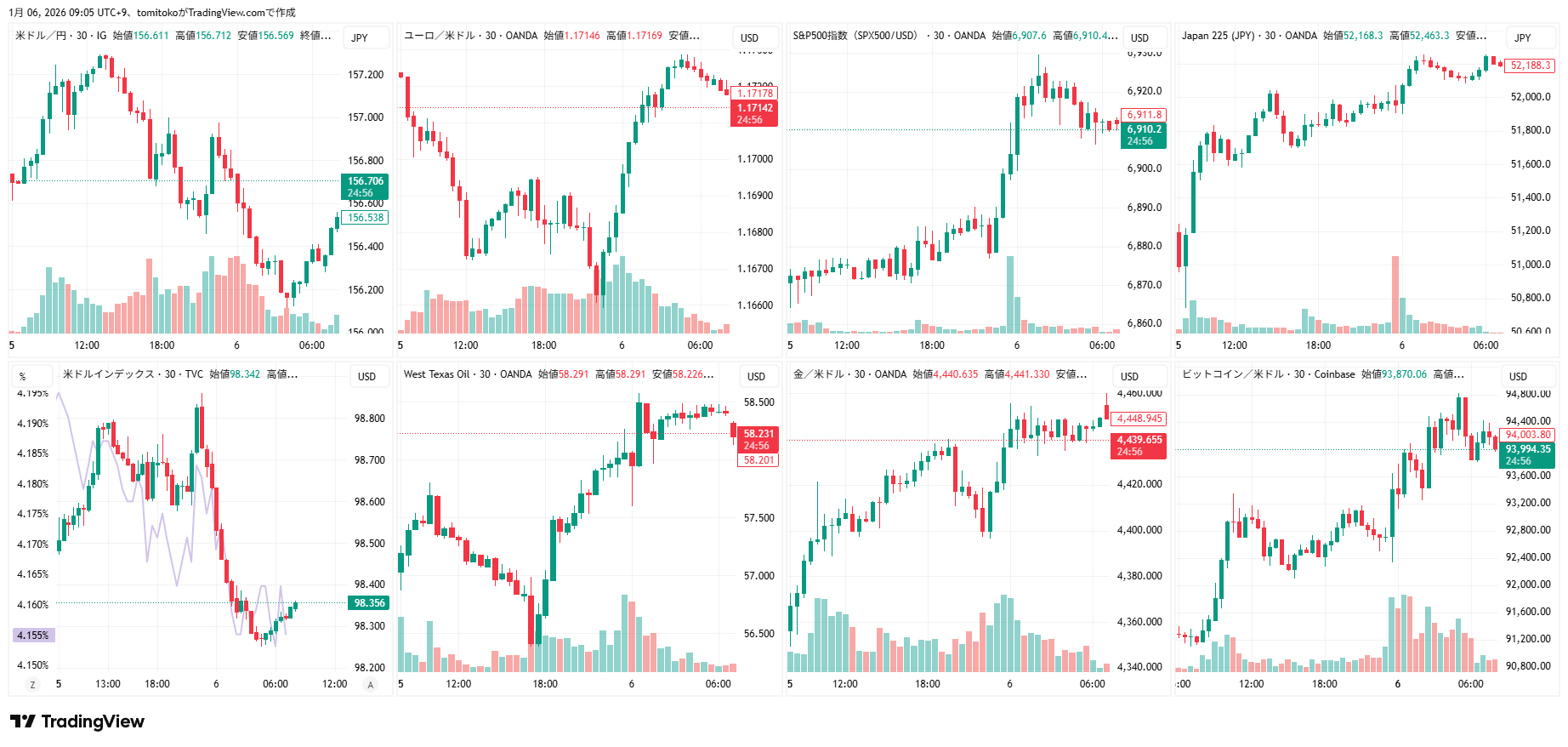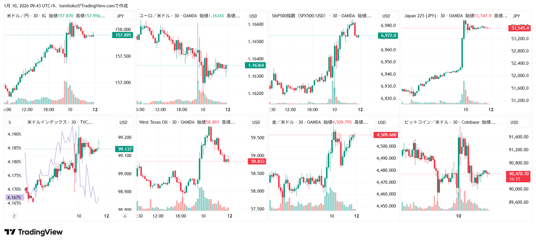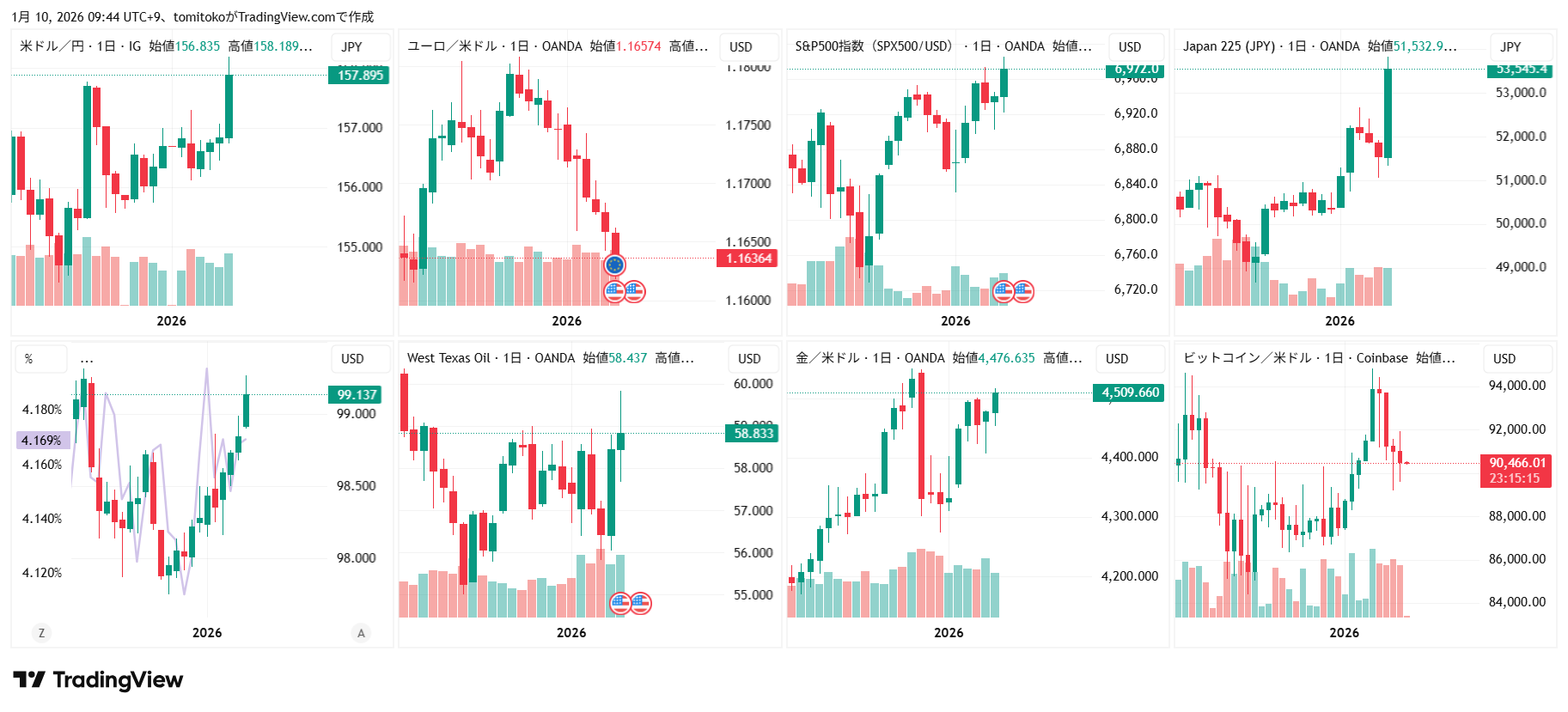 ドル円(USDJPY)、ドルインデックス(DXY)、ユーロドル(EURUSD)、S&P500(SPX500,US500)、日経平均(TVC-NI225)、米国債10年物利回り(TVC-US10Y)、WTI原油(WTICOUS)、金(XAUUSD)、ビットコイン(BTCUSD)、を監視しています。