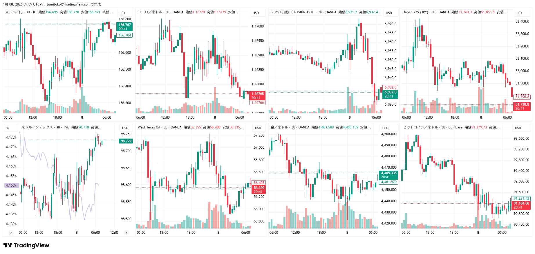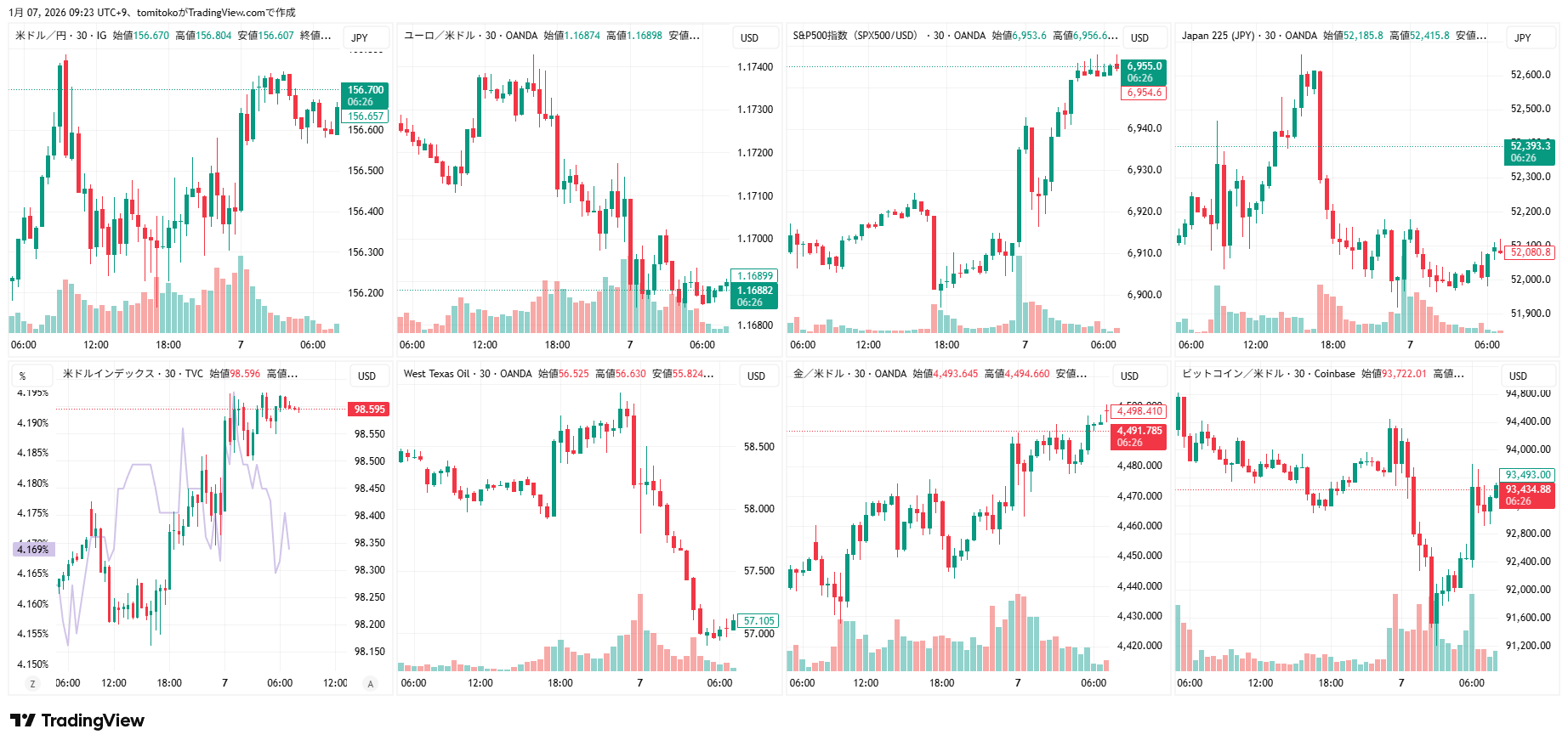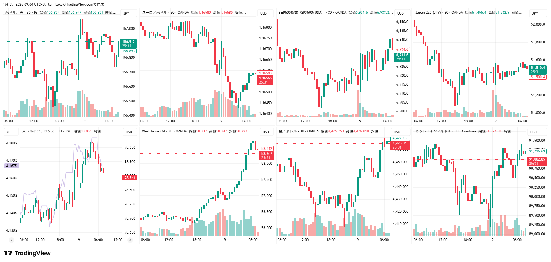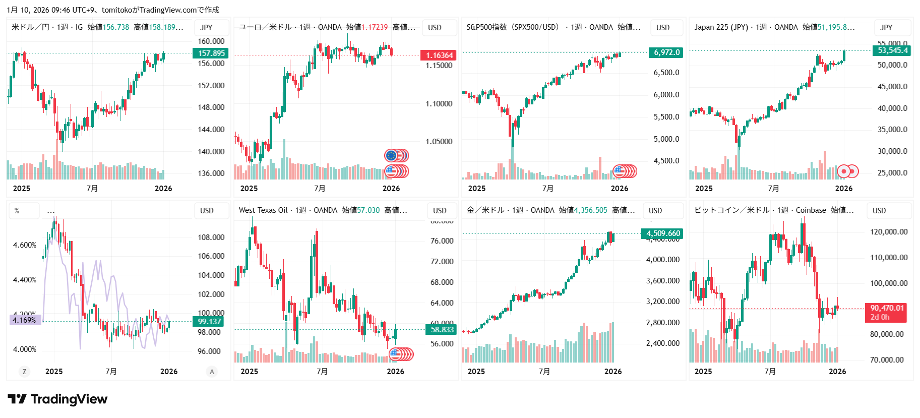 ドル円(USDJPY)、ドルインデックス(DXY)、ユーロドル(EURUSD)、S&P500(SPX500,US500)、日経平均(TVC-NI225)、米国債10年物利回り(TVC-US10Y)、WTI原油(WTICOUS)、金(XAUUSD)、ビットコイン(BTCUSD)、を監視しています。