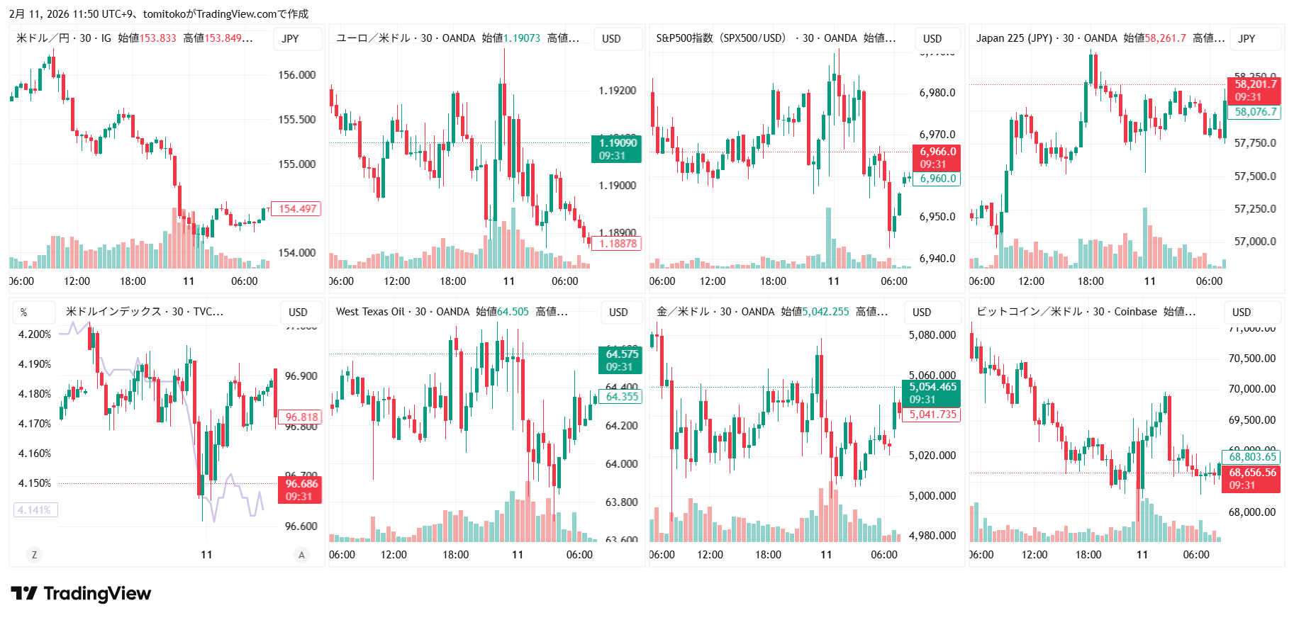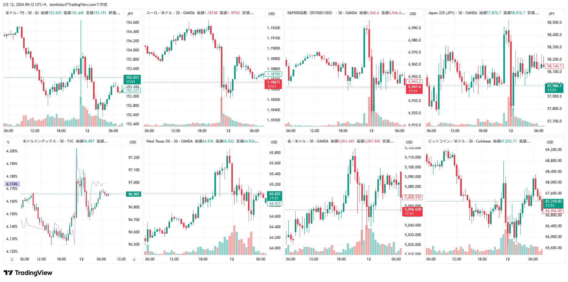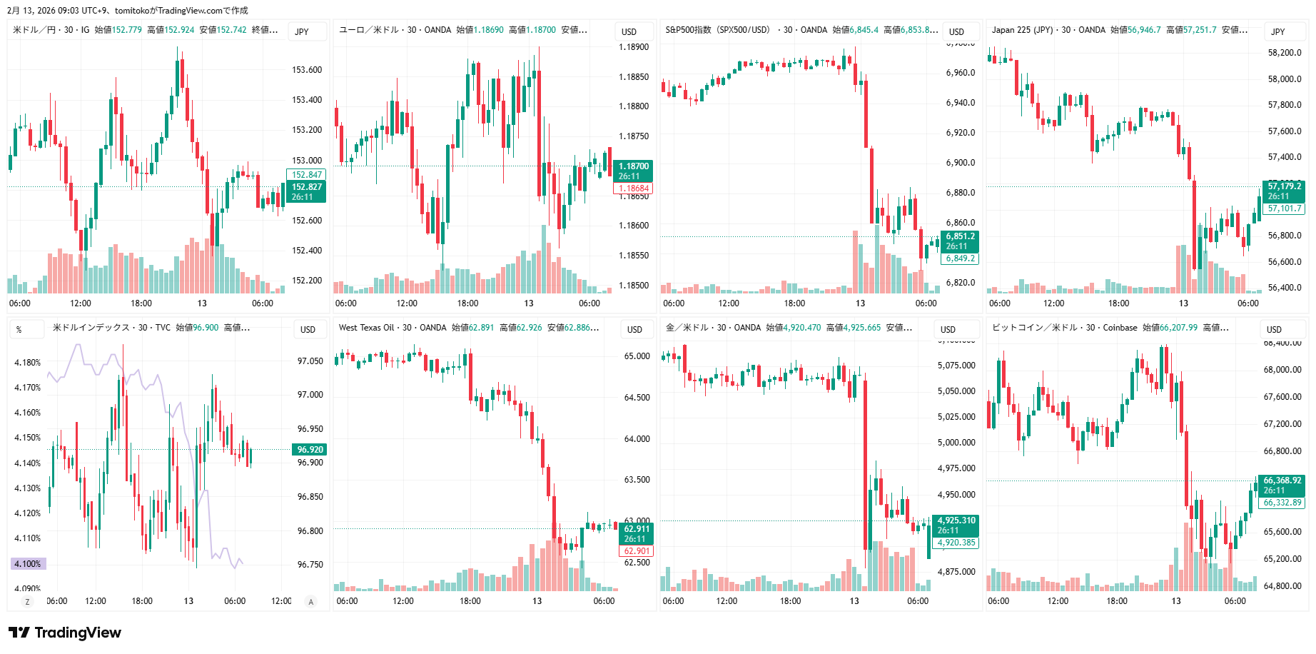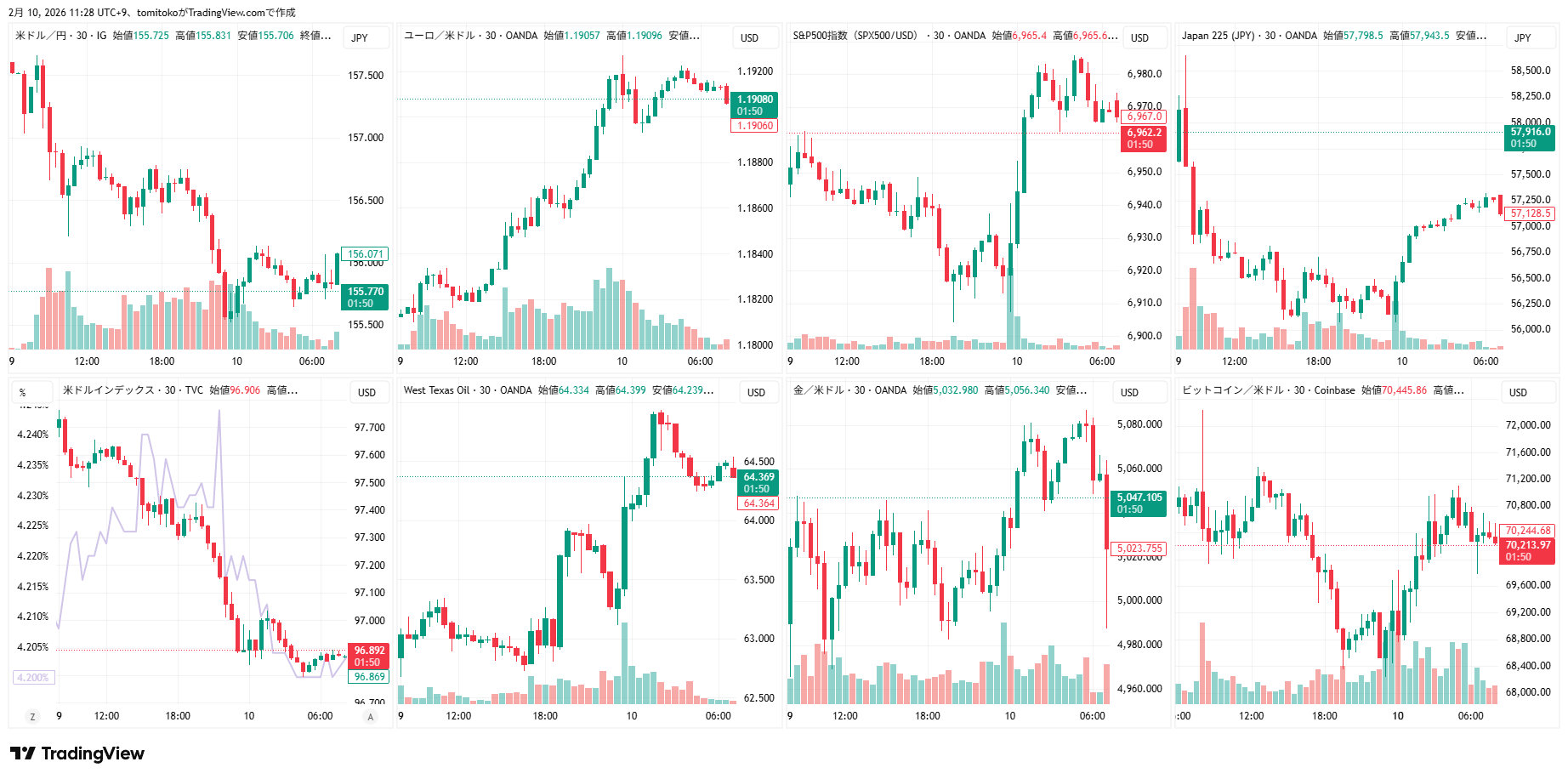 ドル円(USDJPY)、ドルインデックス(DXY)、ユーロドル(EURUSD)、S&P500(SPX500,US500)、日経平均(TVC-NI225)、米国債10年物利回り(TVC-US10Y)、WTI原油(WTICOUS)、金(XAUUSD)、ビットコイン(BTCUSD)、を監視しています。