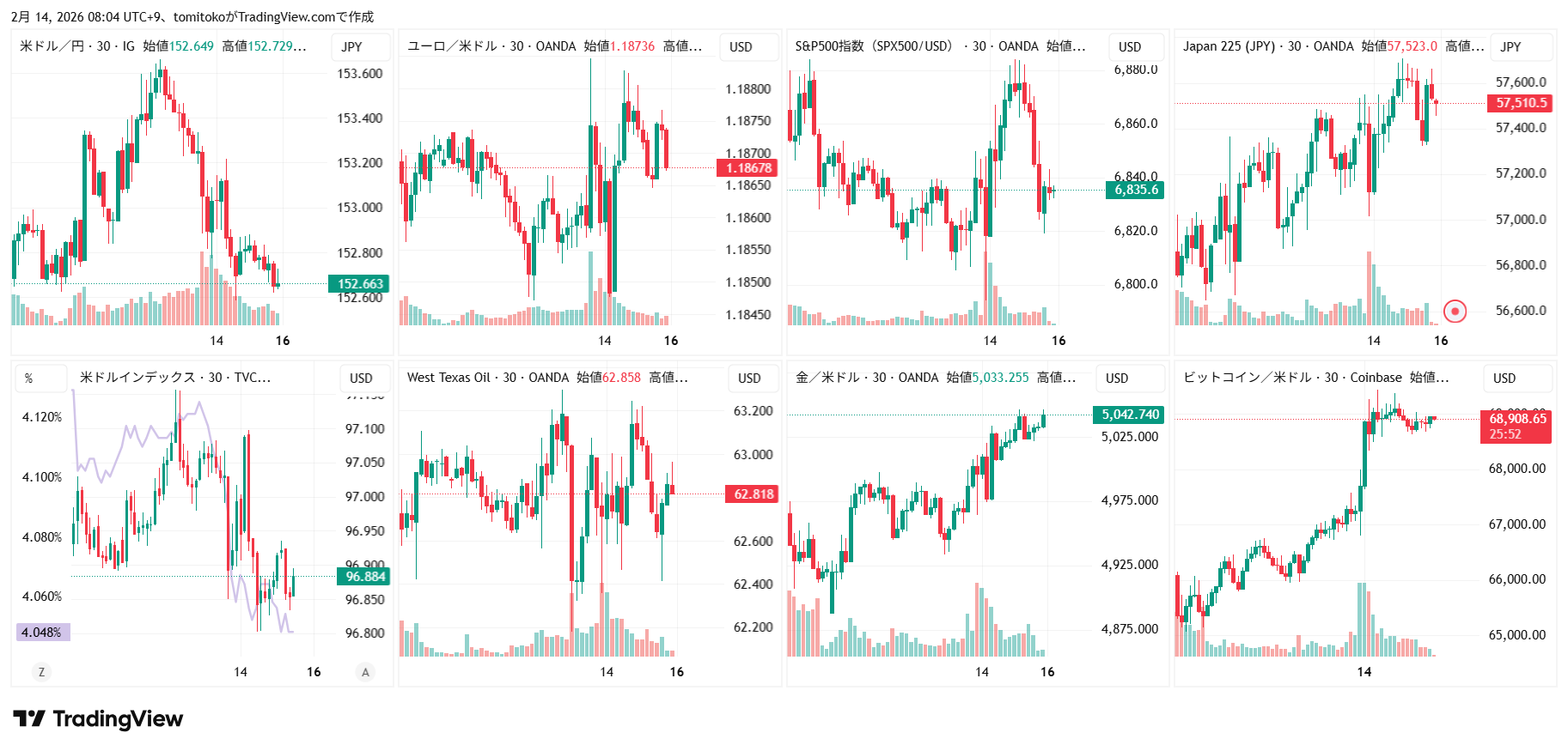 ドル円(USDJPY)、ドルインデックス(DXY)、ダウ(DJ-DJI)、ナスダック(NASDAQ-NDX)、日経平均(TVC-NI225)、米国債10年物利回り(TVC-US10Y)、WTI原油(WTICOUS)、金(XAUUSD)、ビットコイン(BTCUSD)、を監視しています。