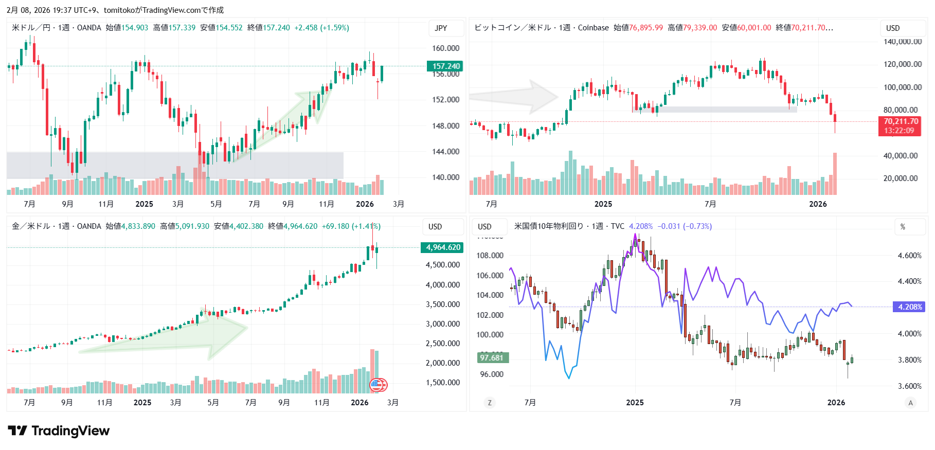 【ドル円・金・ビットコイン】チャートいたずら描き:2026年2月9日~【予想と願望93】