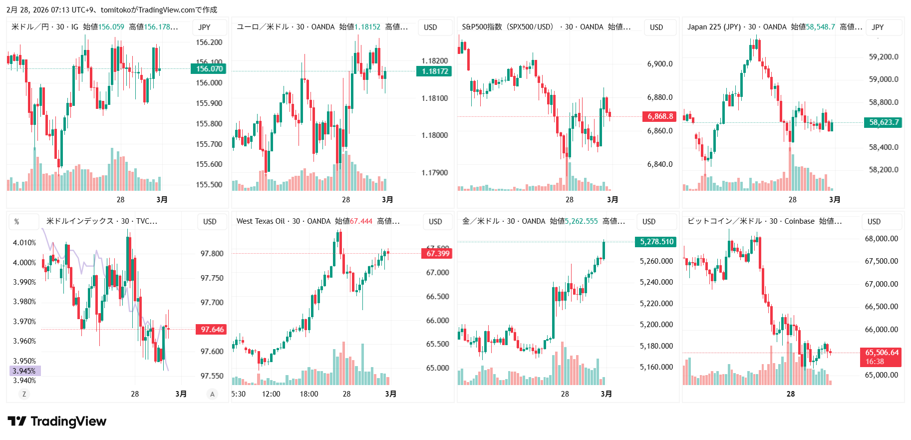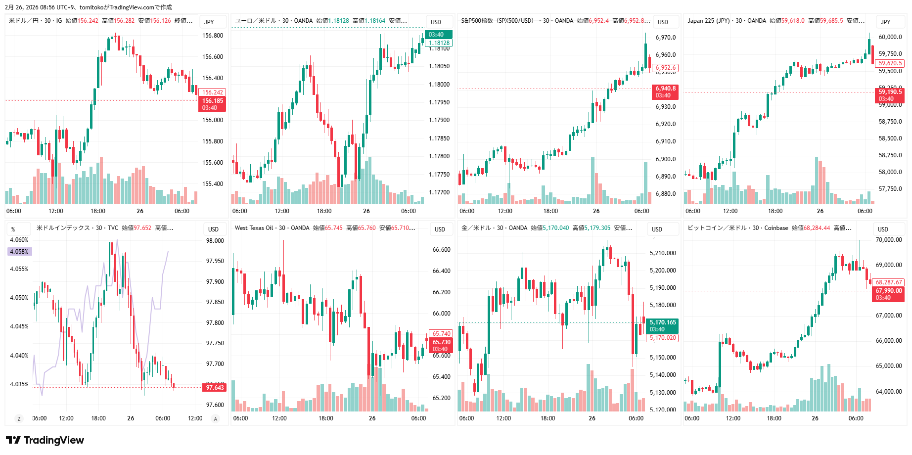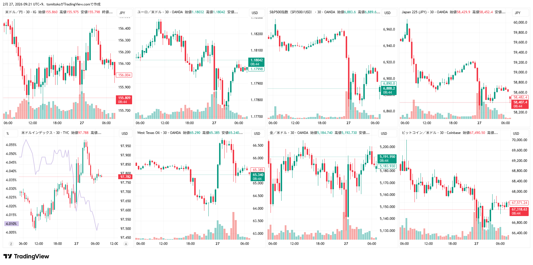 ドル円(USDJPY)、ドルインデックス(DXY)、ユーロドル(EURUSD)、S&P500(SPX500,US500)、日経平均(TVC-NI225)、米国債10年物利回り(TVC-US10Y)、WTI原油(WTICOUS)、金(XAUUSD)、ビットコイン(BTCUSD)、を監視しています。