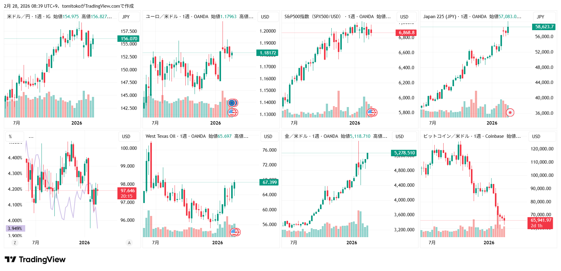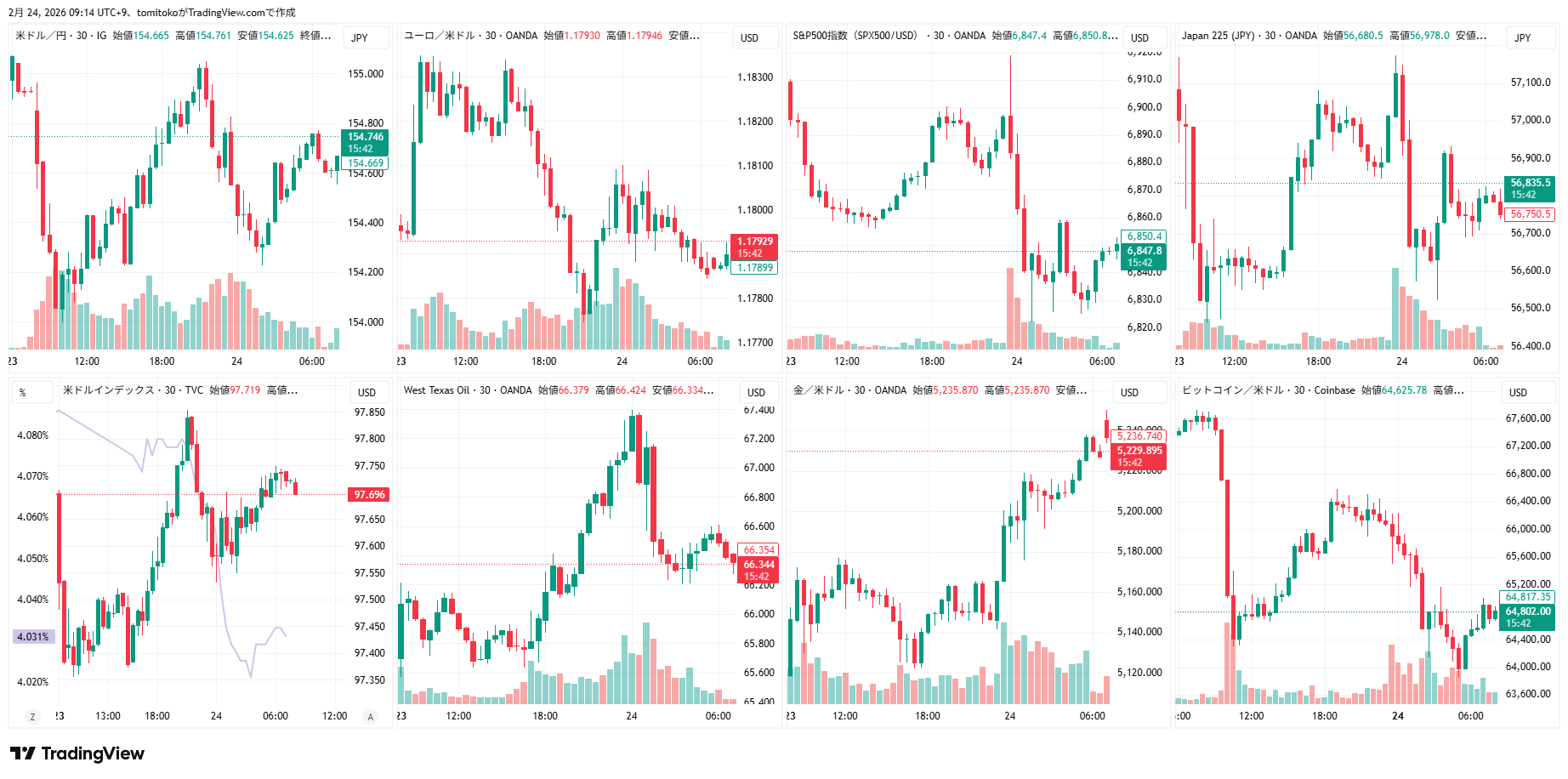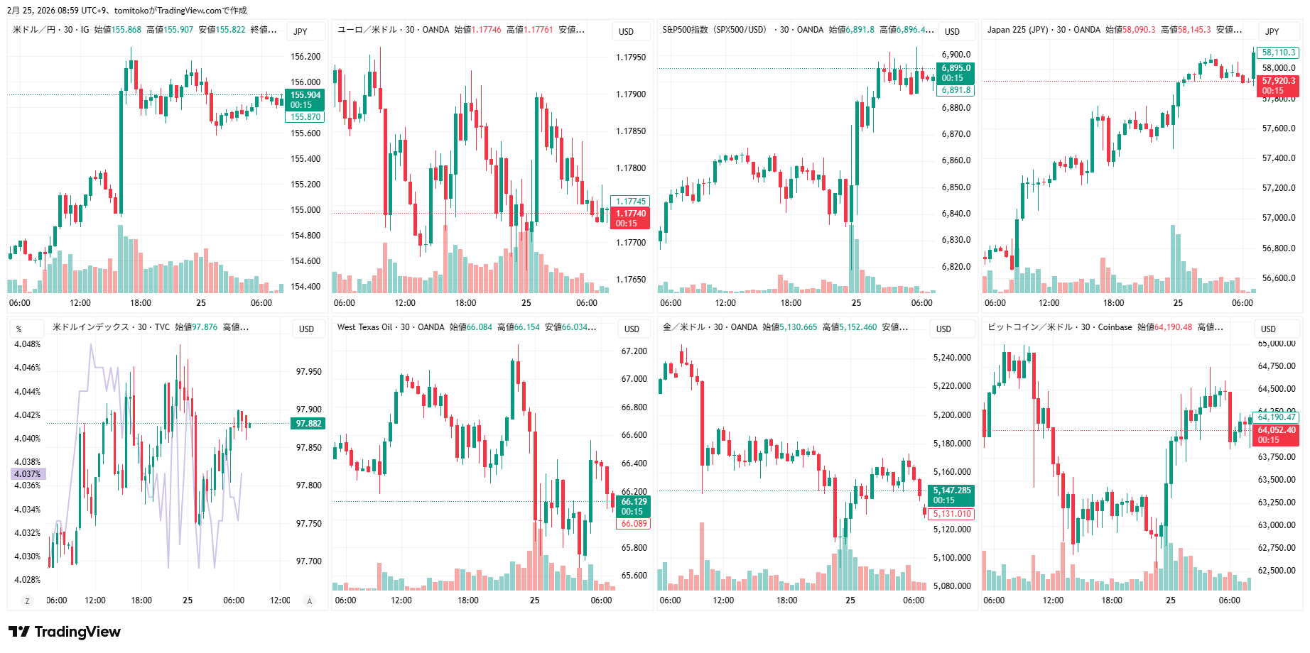 ドル円(USDJPY)、ドルインデックス(DXY)、ユーロドル(EURUSD)、S&P500(SPX500,US500)、日経平均(TVC-NI225)、米国債10年物利回り(TVC-US10Y)、WTI原油(WTICOUS)、金(XAUUSD)、ビットコイン(BTCUSD)、を監視しています。