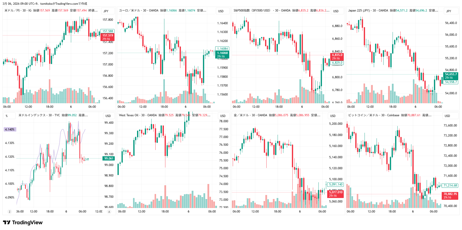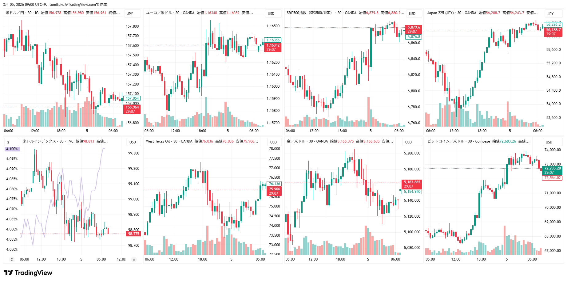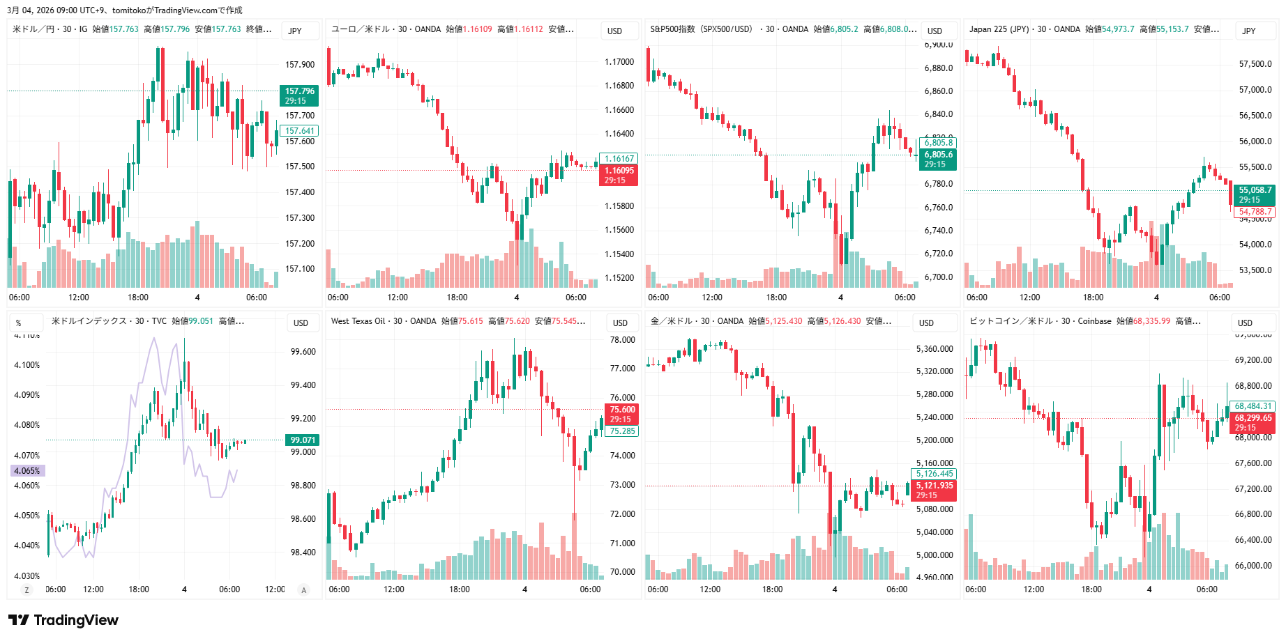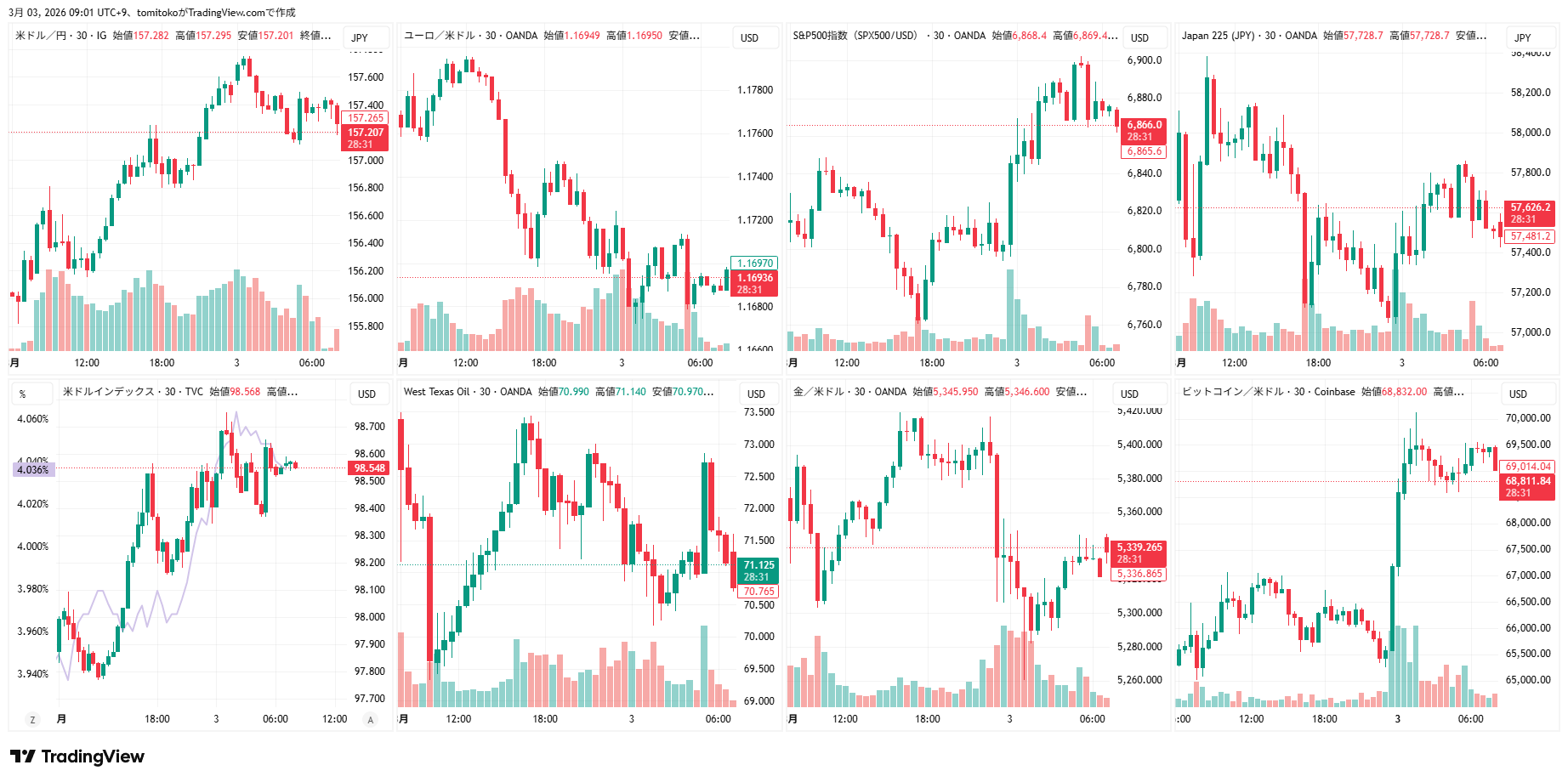 【3/2(月)】中東緊迫、米株荒い値動きも横ばい、ドル円157円台前半【損益:×】
