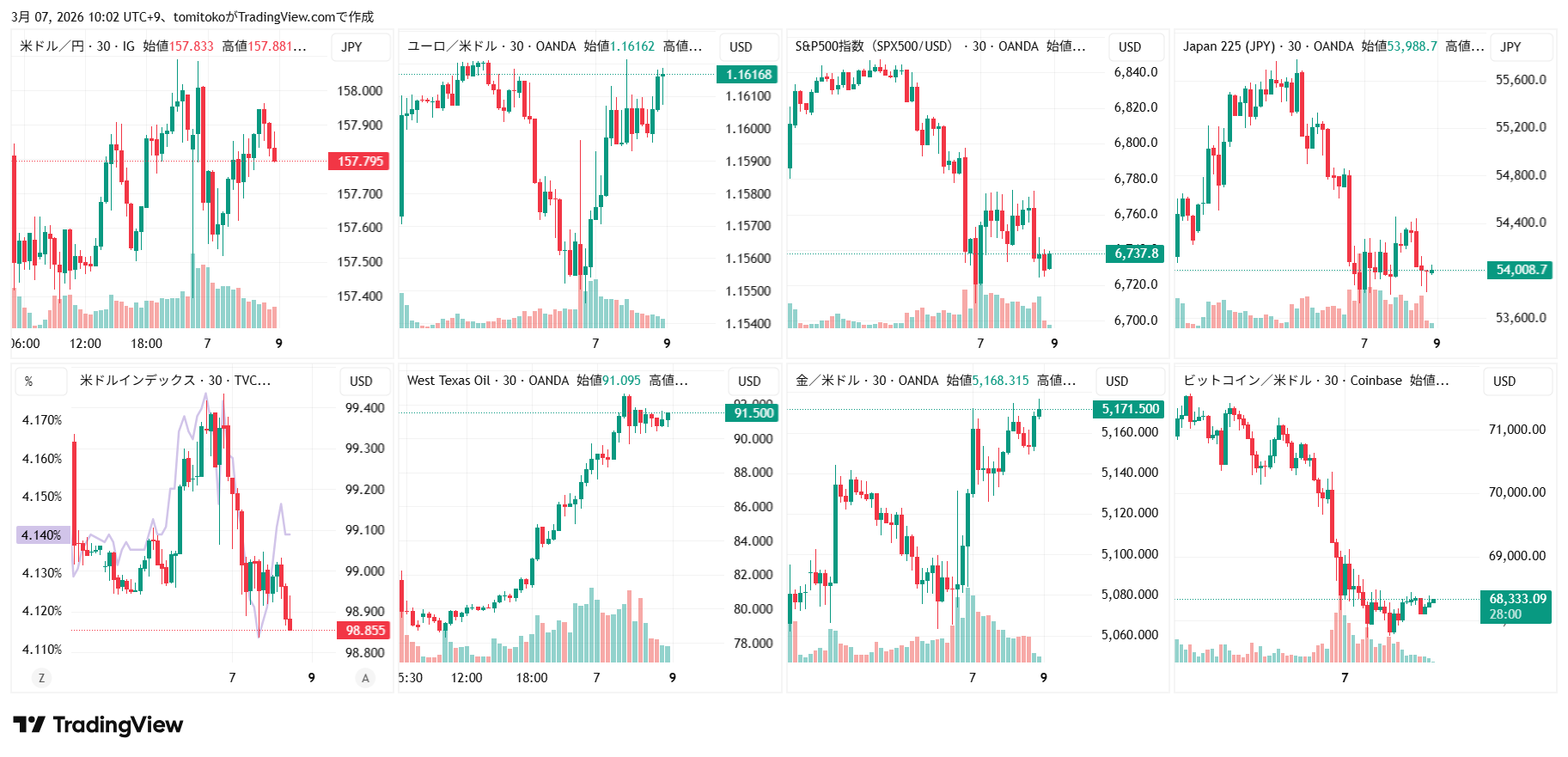 ドル円(USDJPY)、ドルインデックス(DXY)、ユーロドル(EURUSD)、S&P500(SPX500,US500)、日経平均(TVC-NI225)、米国債10年物利回り(TVC-US10Y)、WTI原油(WTICOUS)、金(XAUUSD)、ビットコイン(BTCUSD)、を監視しています。