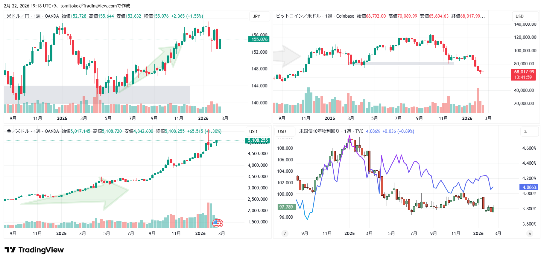 【ドル円・金・ビットコイン】チャートいたずら描き:2026年2月16日~【予想と願望94】