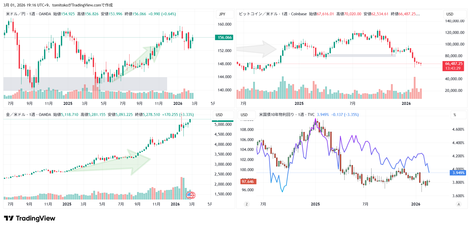 【ドル円・金・ビットコイン】チャートいたずら描き:2026年3月2日~【予想と願望96】