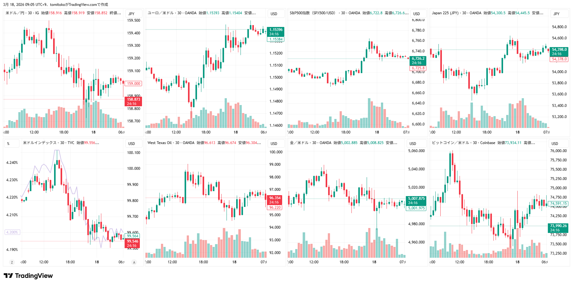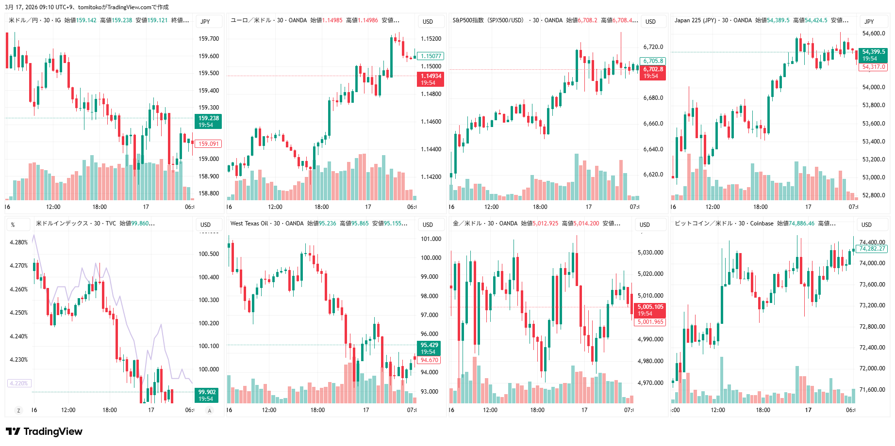 【3/17(火)】原油高が一服で米株続伸、ドル円159円付近【損益:〇】