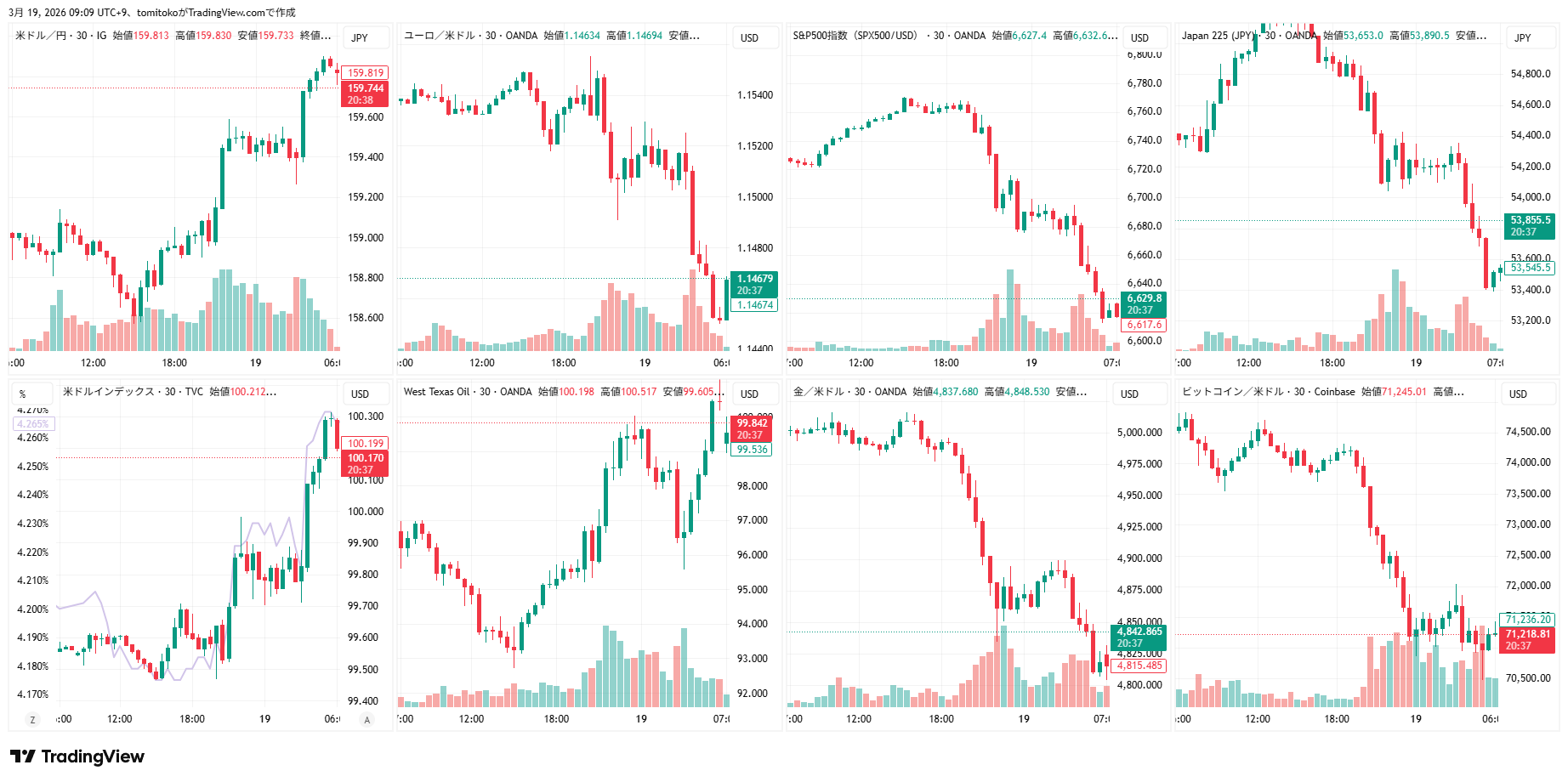 【3/16(月)】ホルムズ緊張緩和期待から原油価格下落、米株反発、ドル円159円付近【損益:×】