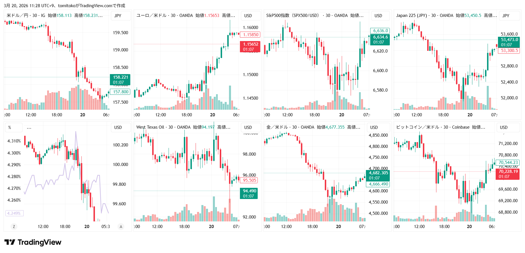 【3/20(金)】中東緊迫長期化懸念で株ゴールド大幅続落、ドル円159円台前半【損益:〇】