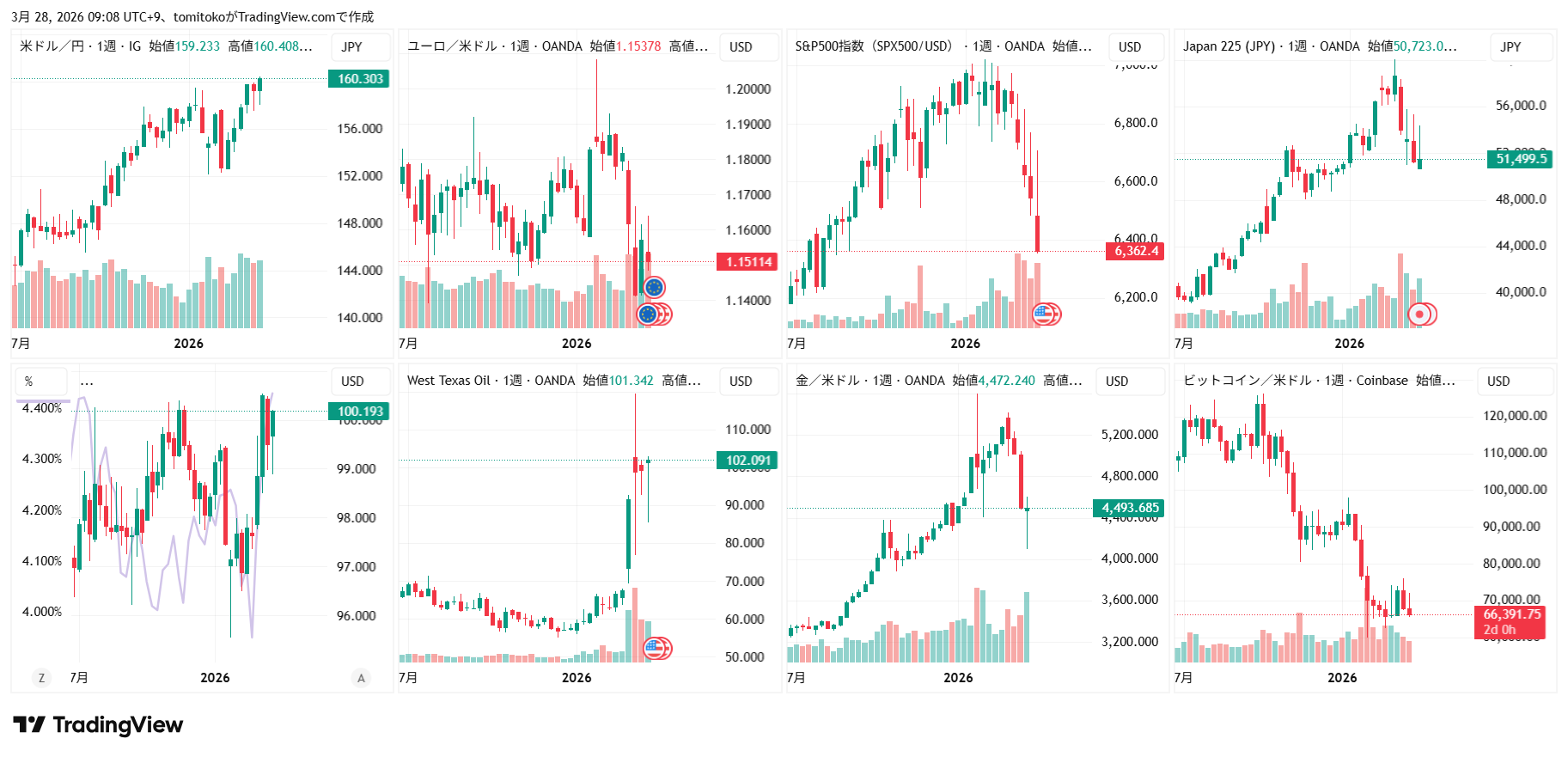 原油100ドル超えドル円160円超えで迎える週末です。イラン情勢長期化が懸念されるなか、今週は原油・ドル・金利上昇、株下落でダウもナスダックも調整局面、ゴールドが4500ドル付近で下げ止まり、ビットコインは7万ドルを割って下落中です。