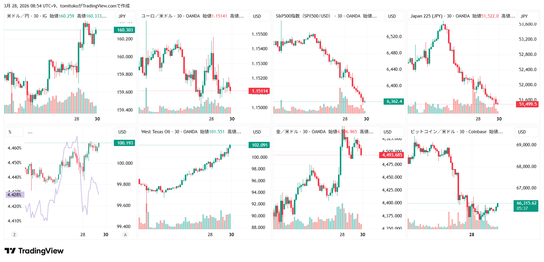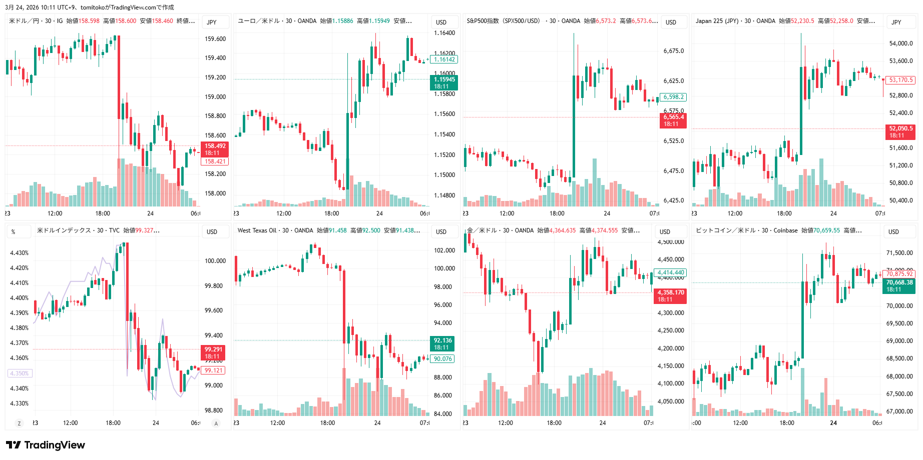 ドル円(USDJPY)、ドルインデックス(DXY)、ダウ(DJ-DJI)、ナスダック(NASDAQ-NDX)、日経平均(TVC-NI225)、米国債10年物利回り(TVC-US10Y)、WTI原油(WTICOUS)、金(XAUUSD)、ビットコイン(BTCUSD)、を監視しています。