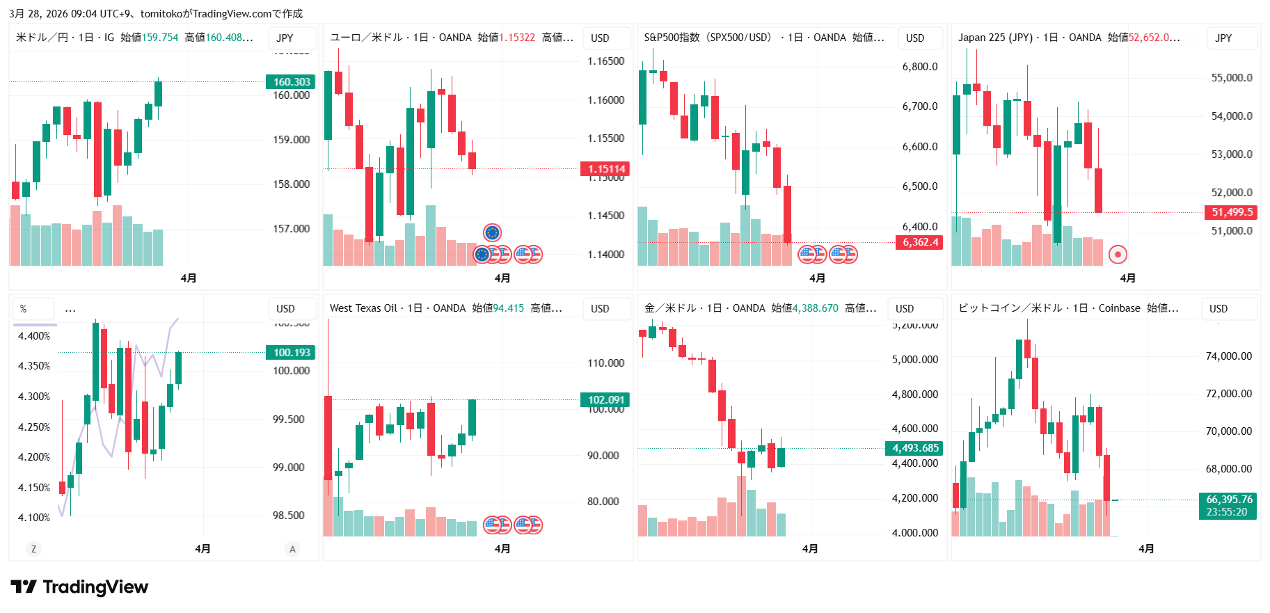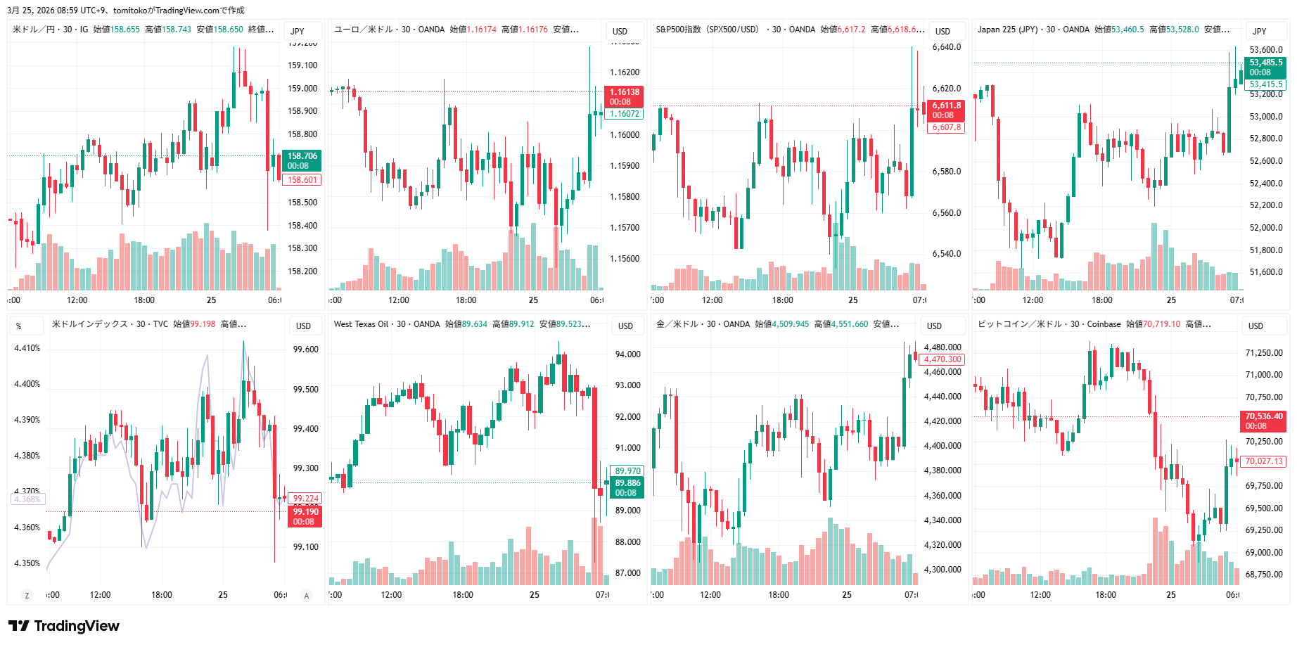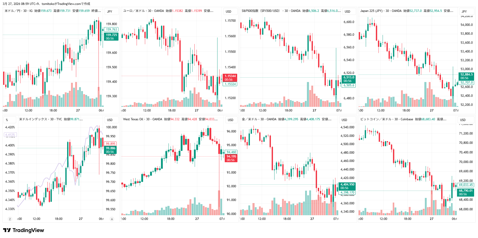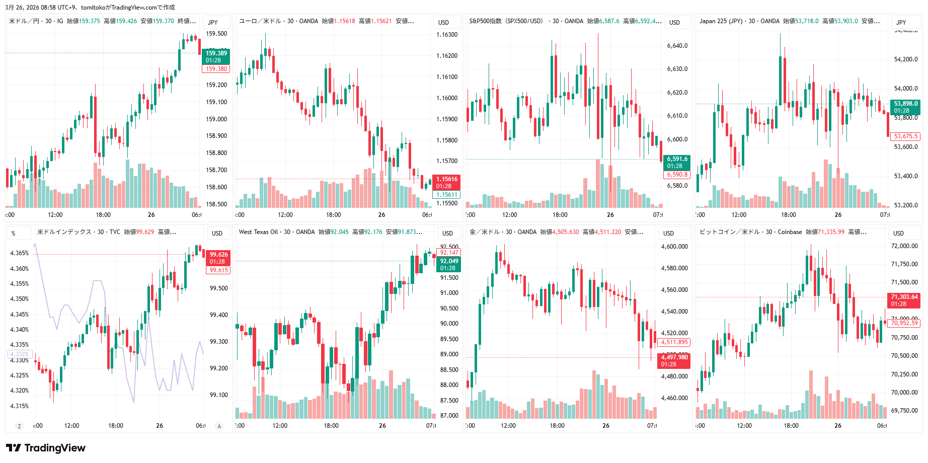 ドル円(USDJPY)、ドルインデックス(DXY)、ユーロドル(EURUSD)、S&P500(SPX500,US500)、日経平均(TVC-NI225)、米国債10年物利回り(TVC-US10Y)、WTI原油(WTICOUS)、金(XAUUSD)、ビットコイン(BTCUSD)、を監視しています。