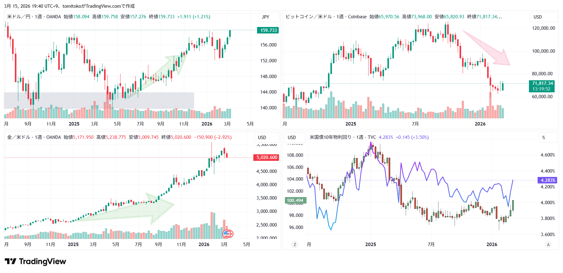 【ドル円・金・ビットコイン】チャートいたずら描き:2026年3月16日~【予想と願望98】