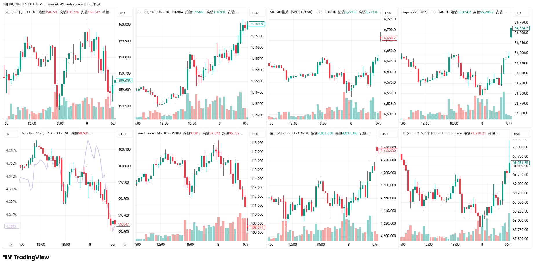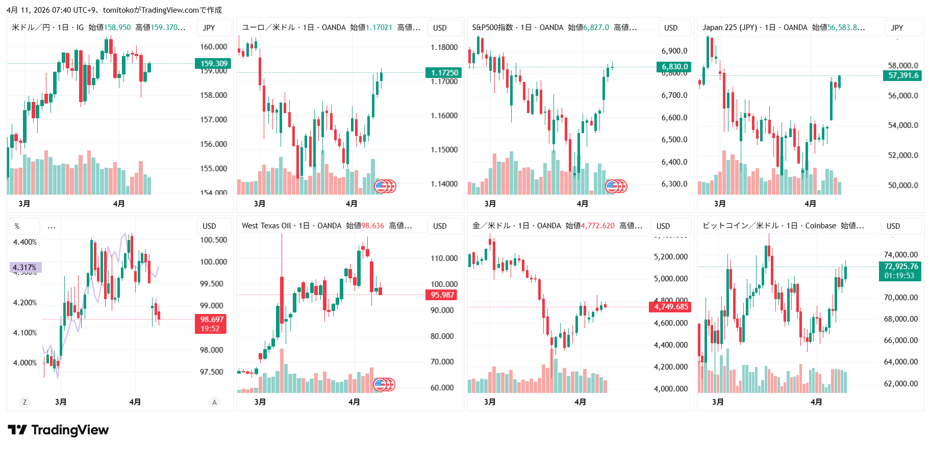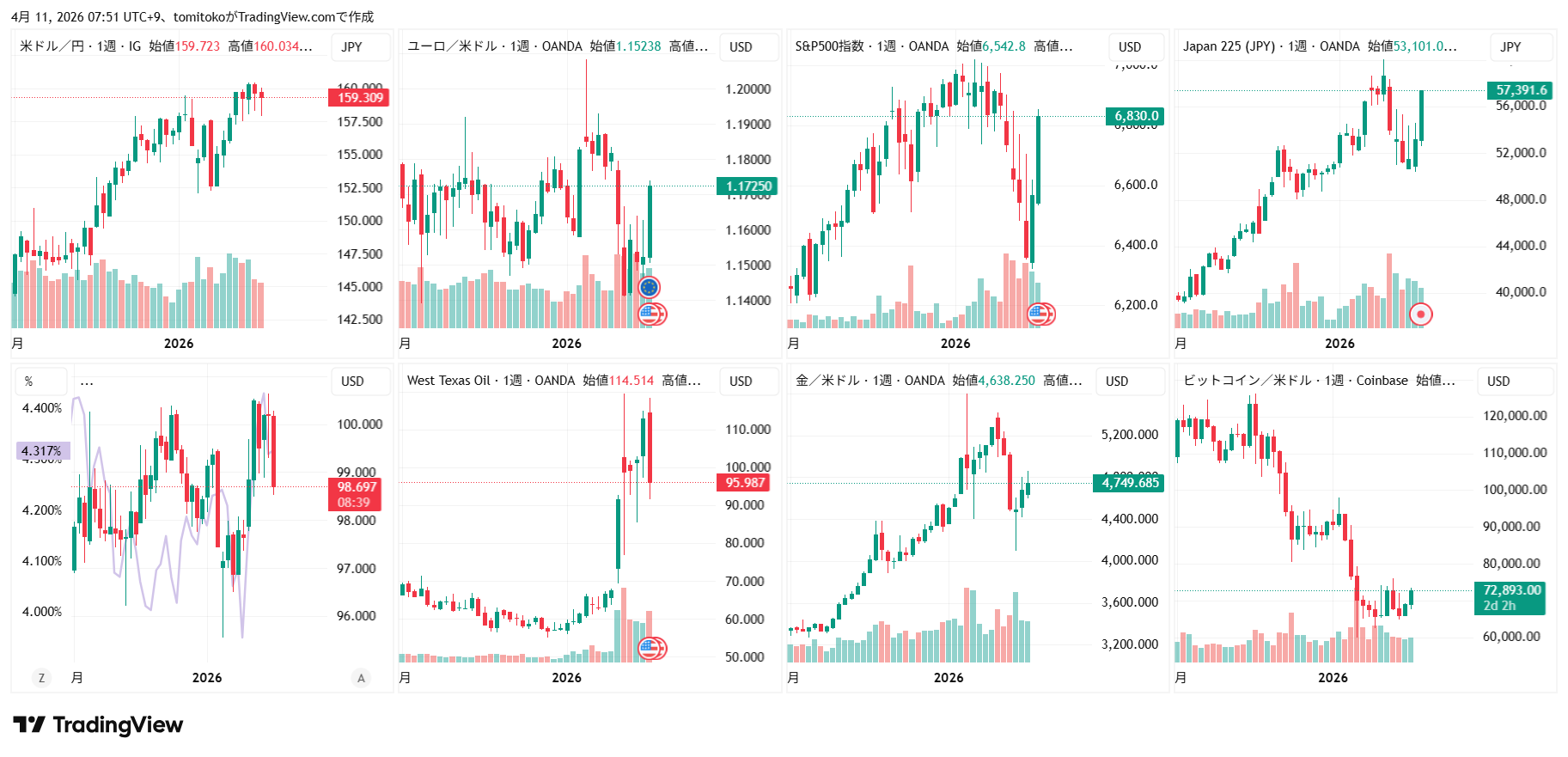 今週は米イラン2週間停戦で緊張がかなり和らぎました。原油100ドル割れ、ドル安でドル円159円台前半、株は急騰、金とビットコインはやや上昇です。
