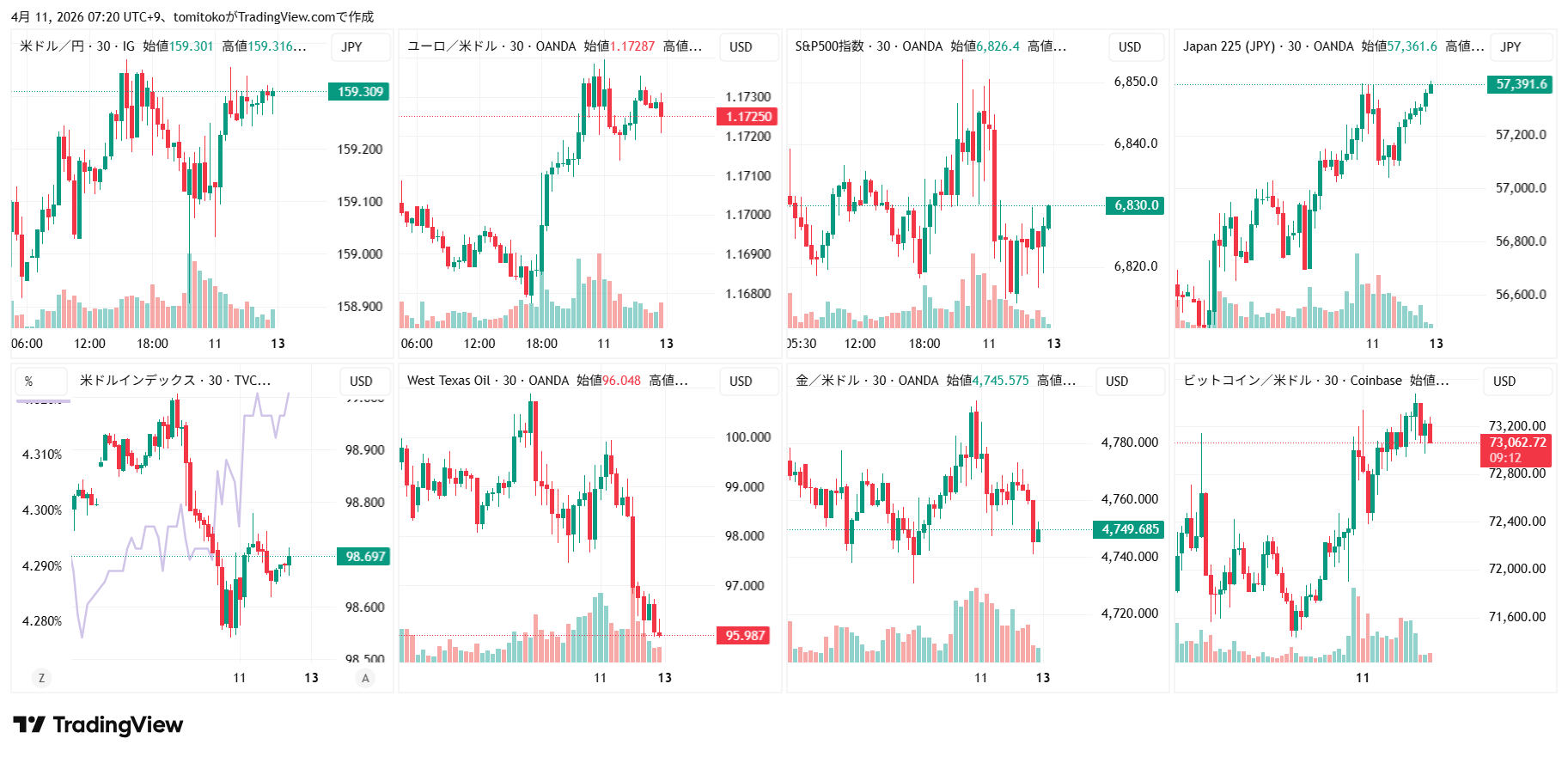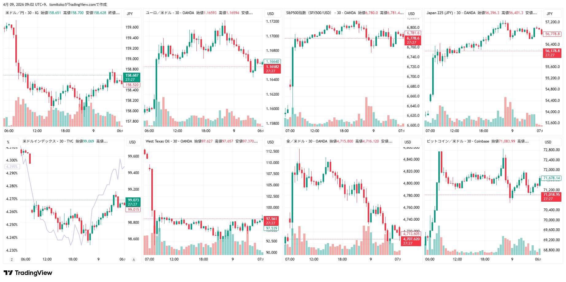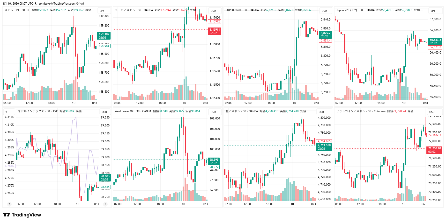 今週は米イラン2週間停戦で緊張がかなり和らぎました。原油100ドル割れ、ドル安でドル円159円台前半、株は急騰、金とビットコインはやや上昇です。