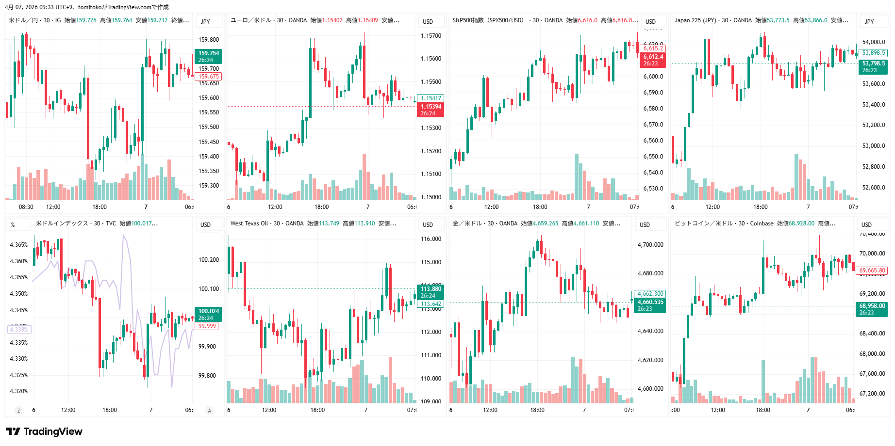 【4/6(月)】停戦期待で株上昇も原油高ドル高、ドル円160円に接近【損益:〇】